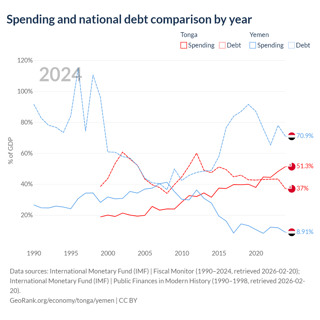 Tonga has $256M in government debt (37% of GDP), compared to $18.8B (70.9% of GDP) in Yemen.