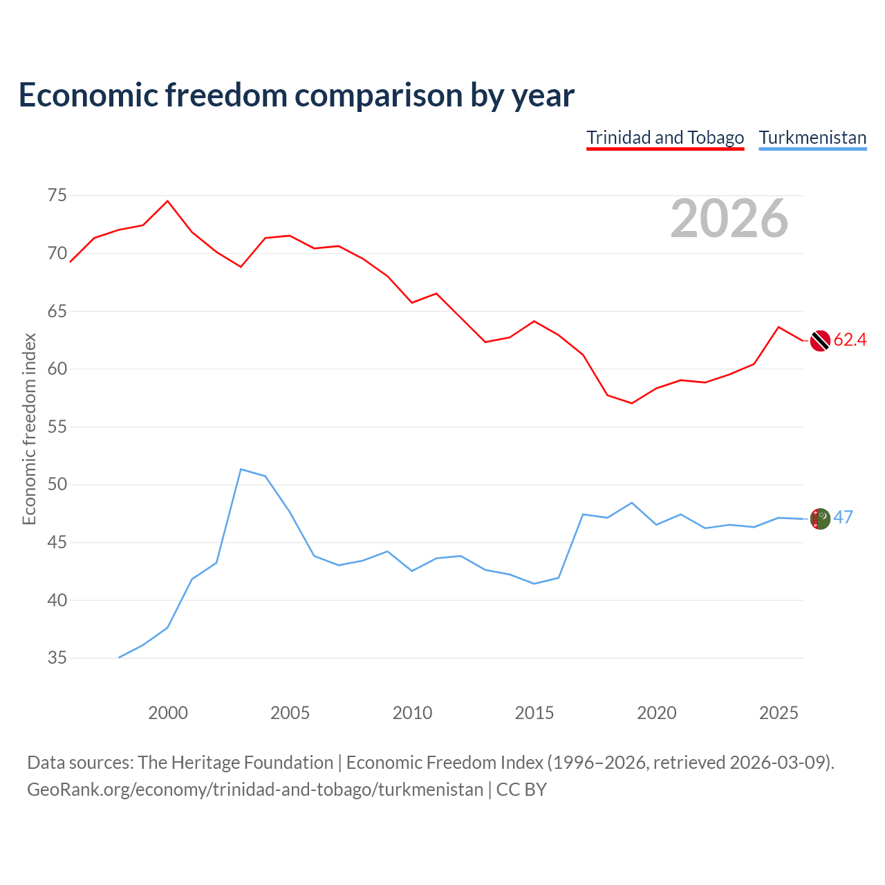 The Economic Freedom Index for Trinidad and Tobago is 62.4, ranking 87/197, compared to 47 for Turkmenistan, ranking 177/197. The chart above displays a comparison of annual changes in economic freedom indexes.
