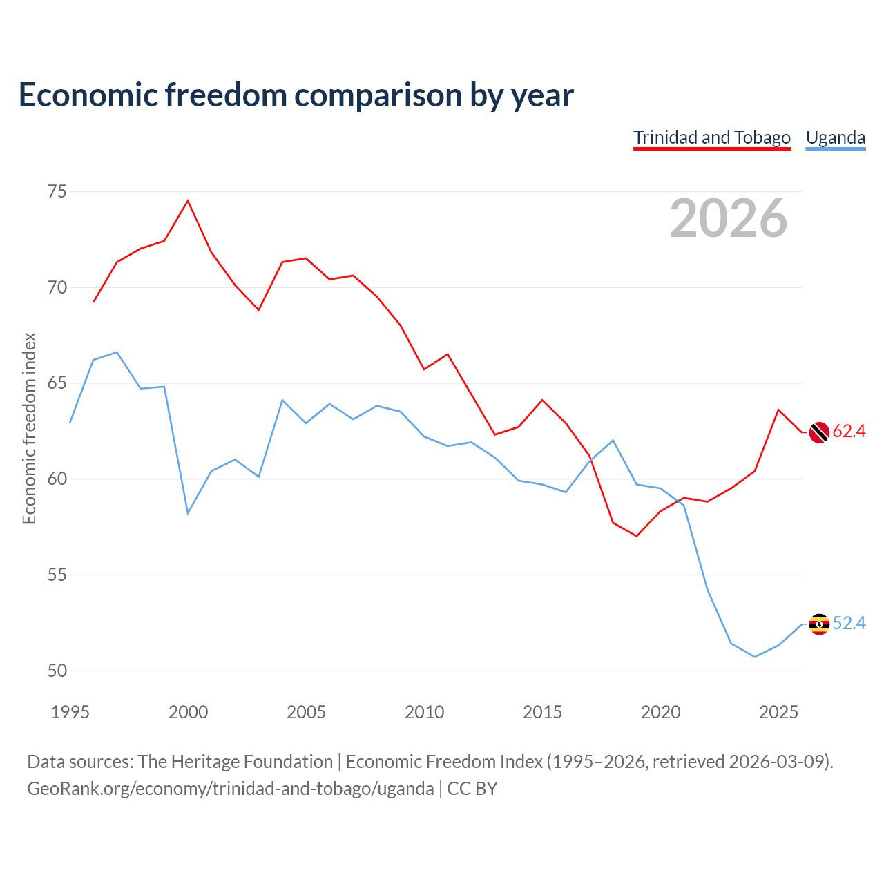 The Economic Freedom Index for Trinidad and Tobago is 62.4, ranking 87/197, compared to 52.4 for Uganda, ranking 149/197. The chart above displays a comparison of annual changes in economic freedom indexes.
