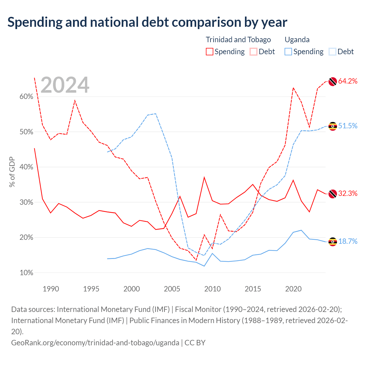 Trinidad and Tobago has $16.5B in government debt (64.2% of GDP), compared to $27.8B (51.5% of GDP) in Uganda.