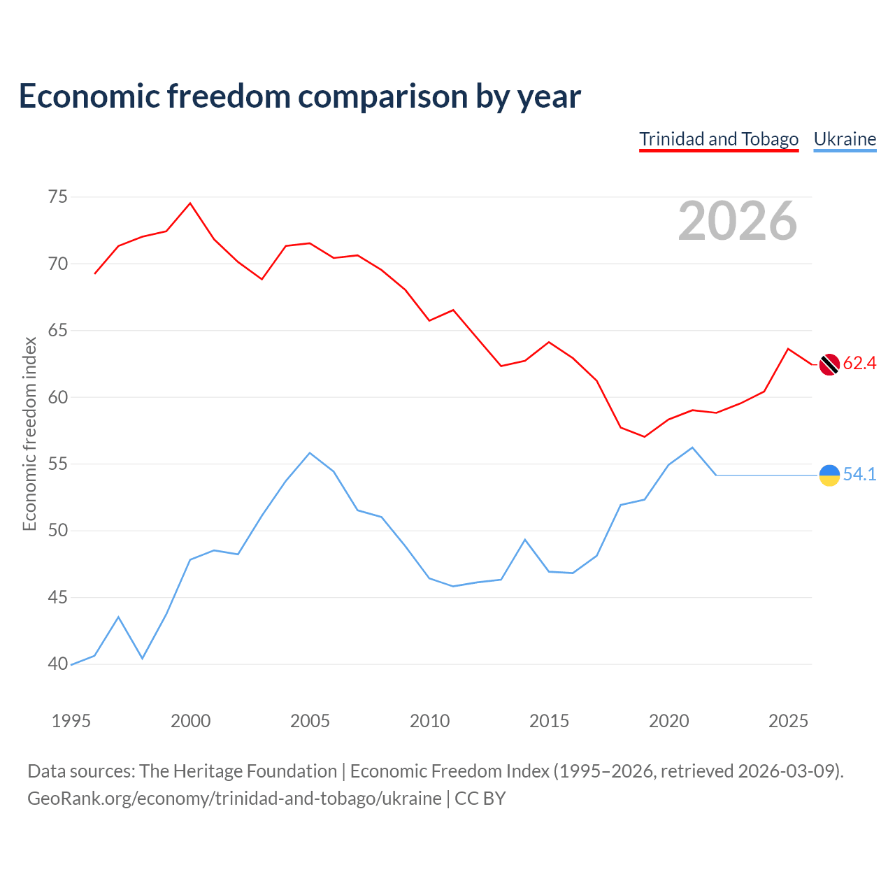 The Economic Freedom Index for Trinidad and Tobago is 62.4, ranking 87/197, compared to 54.1 for Ukraine, ranking 135/197. The chart above displays a comparison of annual changes in economic freedom indexes.