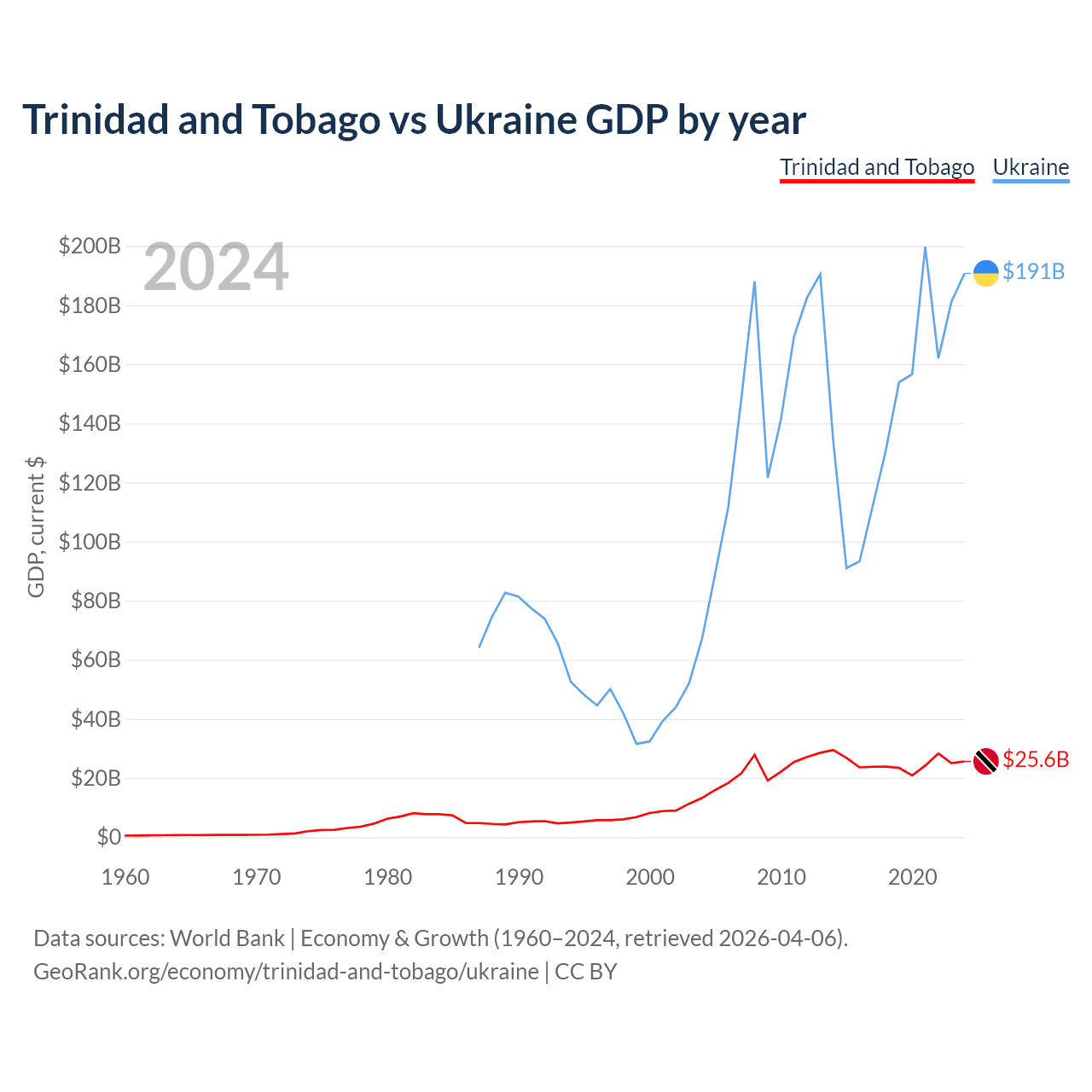 Trinidad and Tobago has a GDP of $25.6B compared to $191B for Ukraine, ranking 115/197 and 57/197 by economy size, respectively.