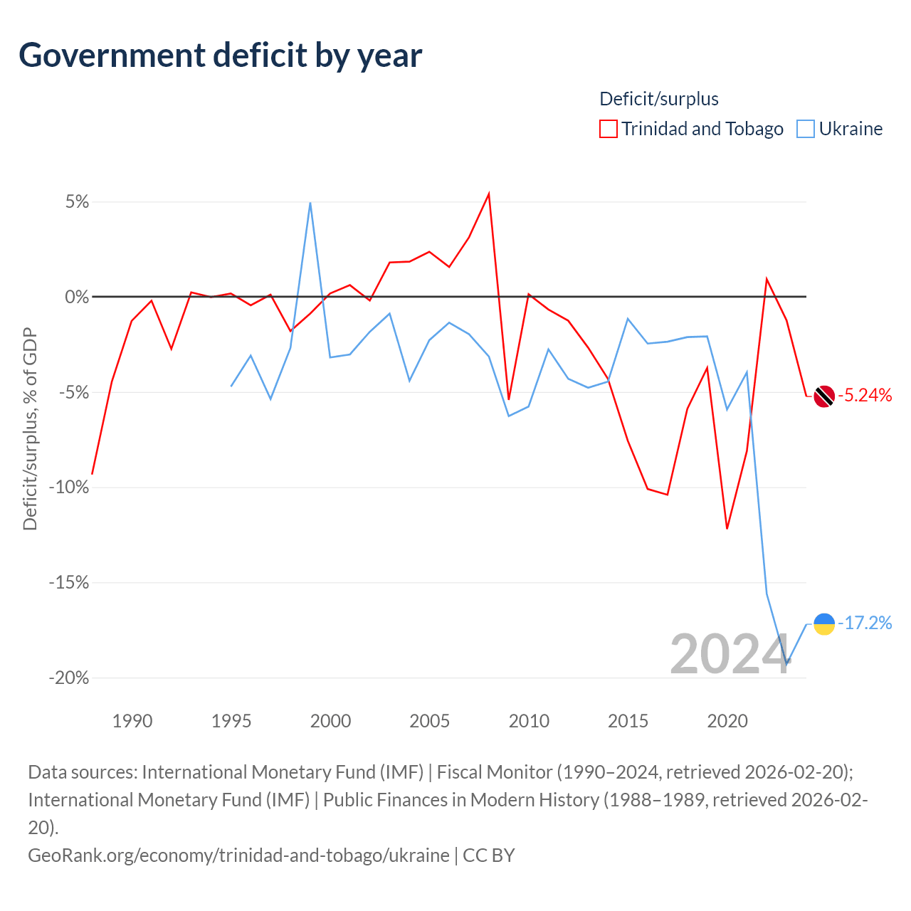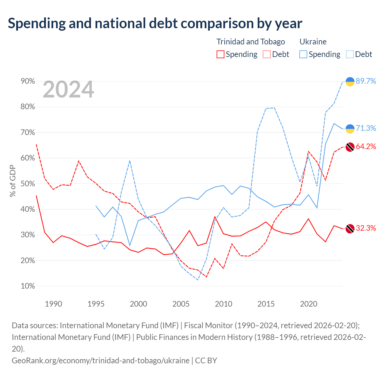 Trinidad and Tobago has $16.5B in government debt (64.2% of GDP), compared to $171B (89.7% of GDP) in Ukraine.