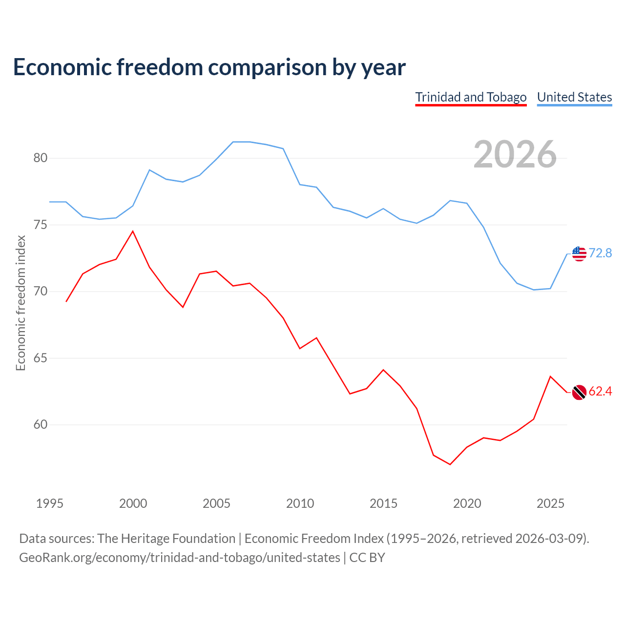 The Economic Freedom Index for Trinidad and Tobago is 62.4, ranking 87/197, compared to 72.8 for the United States, ranking 27/197. The chart above displays a comparison of annual changes in economic freedom indexes.