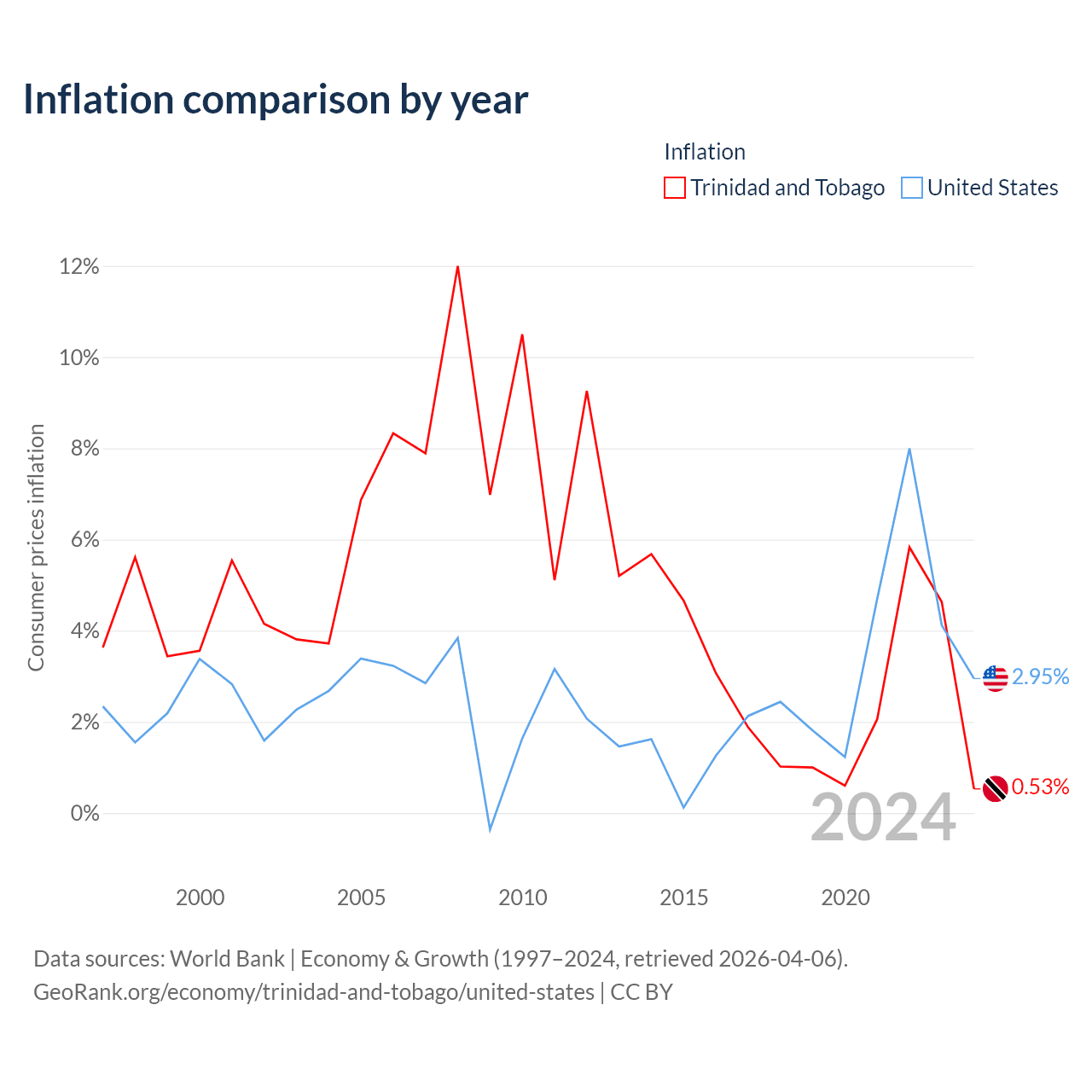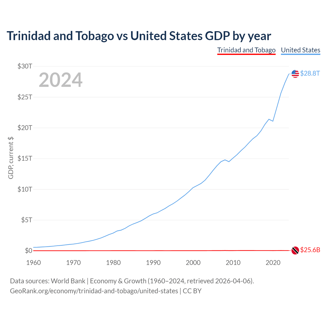 Trinidad and Tobago has a GDP of $25.6B compared to $28.8T for the United States, ranking 115/197 and 1/197 by economy size, respectively.