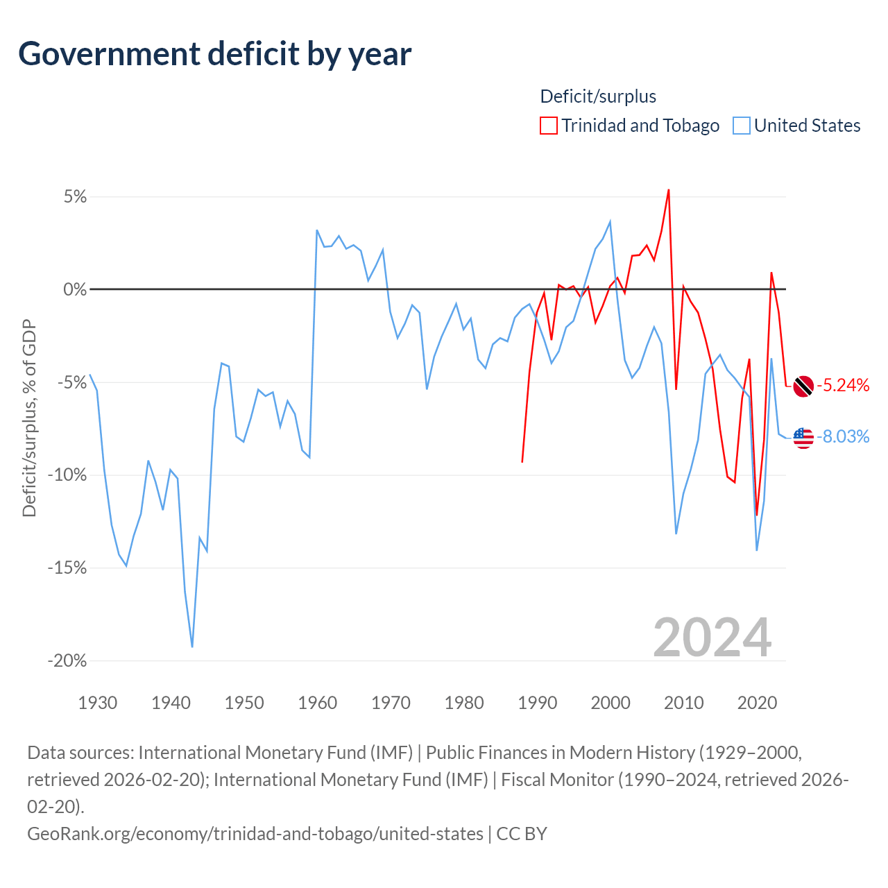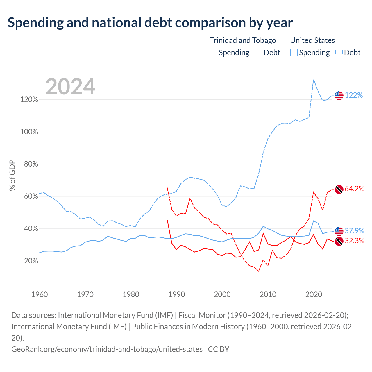 Trinidad and Tobago has $16.5B in government debt (64.2% of GDP), compared to $35.2T (122.3% of GDP) in the United States.