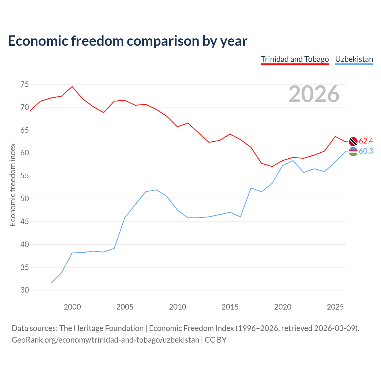 The Economic Freedom Index for Trinidad and Tobago is 62.4, ranking 87/197, compared to 60.3 for Uzbekistan, ranking 94/197. The chart above displays a comparison of annual changes in economic freedom indexes.