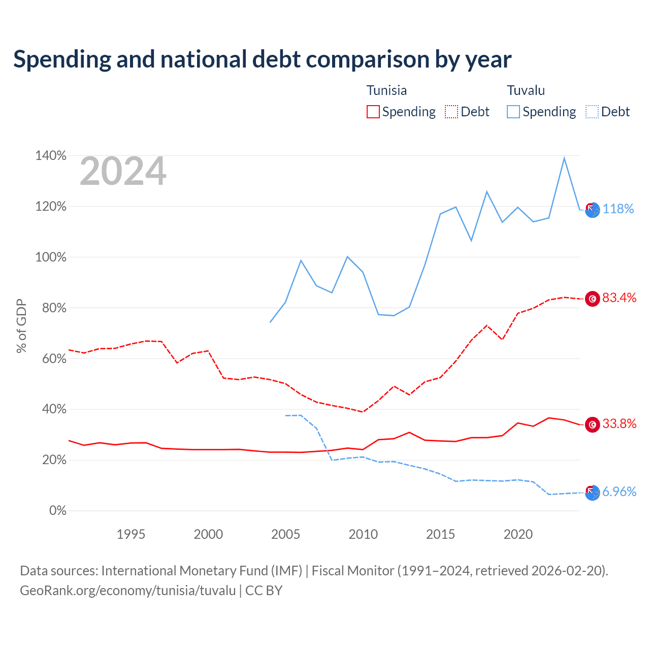 Tunisia has $42.8B in government debt (83.4% of GDP), compared to $4.15M (6.96% of GDP) in Tuvalu.