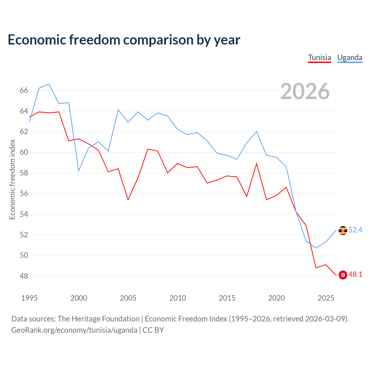 The Economic Freedom Index for Tunisia is 48.1, ranking 172/197, compared to 52.4 for Uganda, ranking 149/197. The chart above displays a comparison of annual changes in economic freedom indexes.