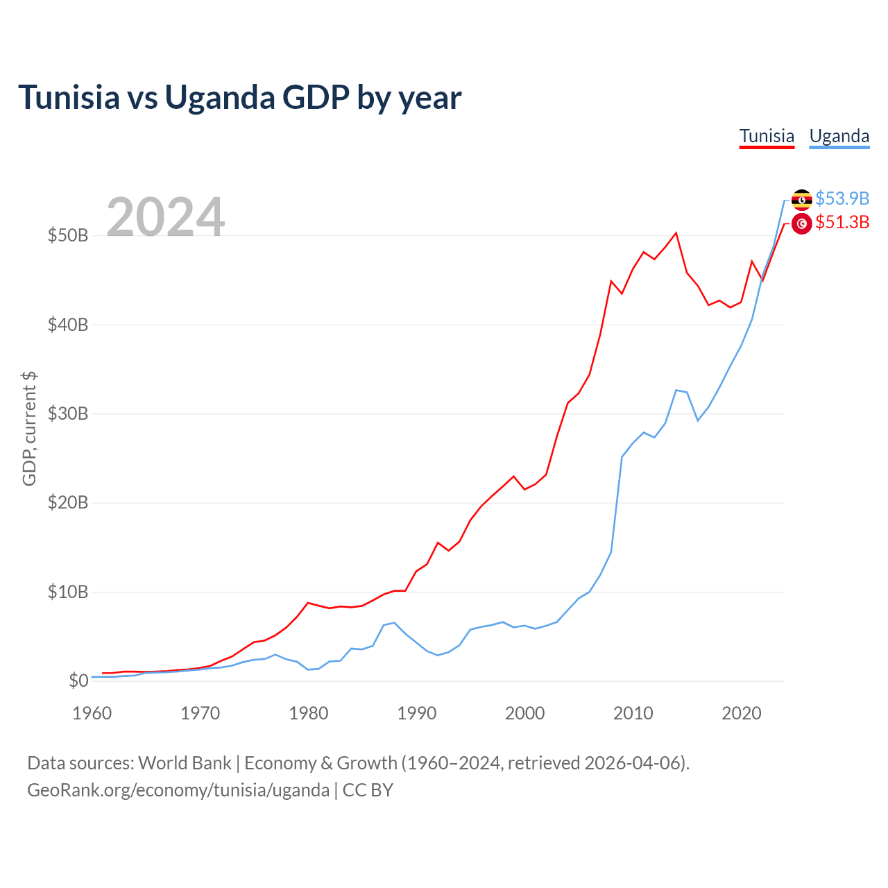 Tunisia has a GDP of $51.3B compared to $53.9B for Uganda, ranking 93/197 and 89/197 by economy size, respectively.