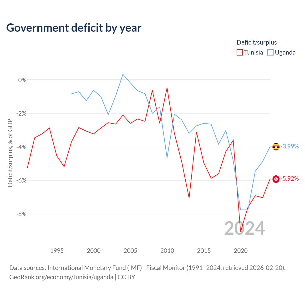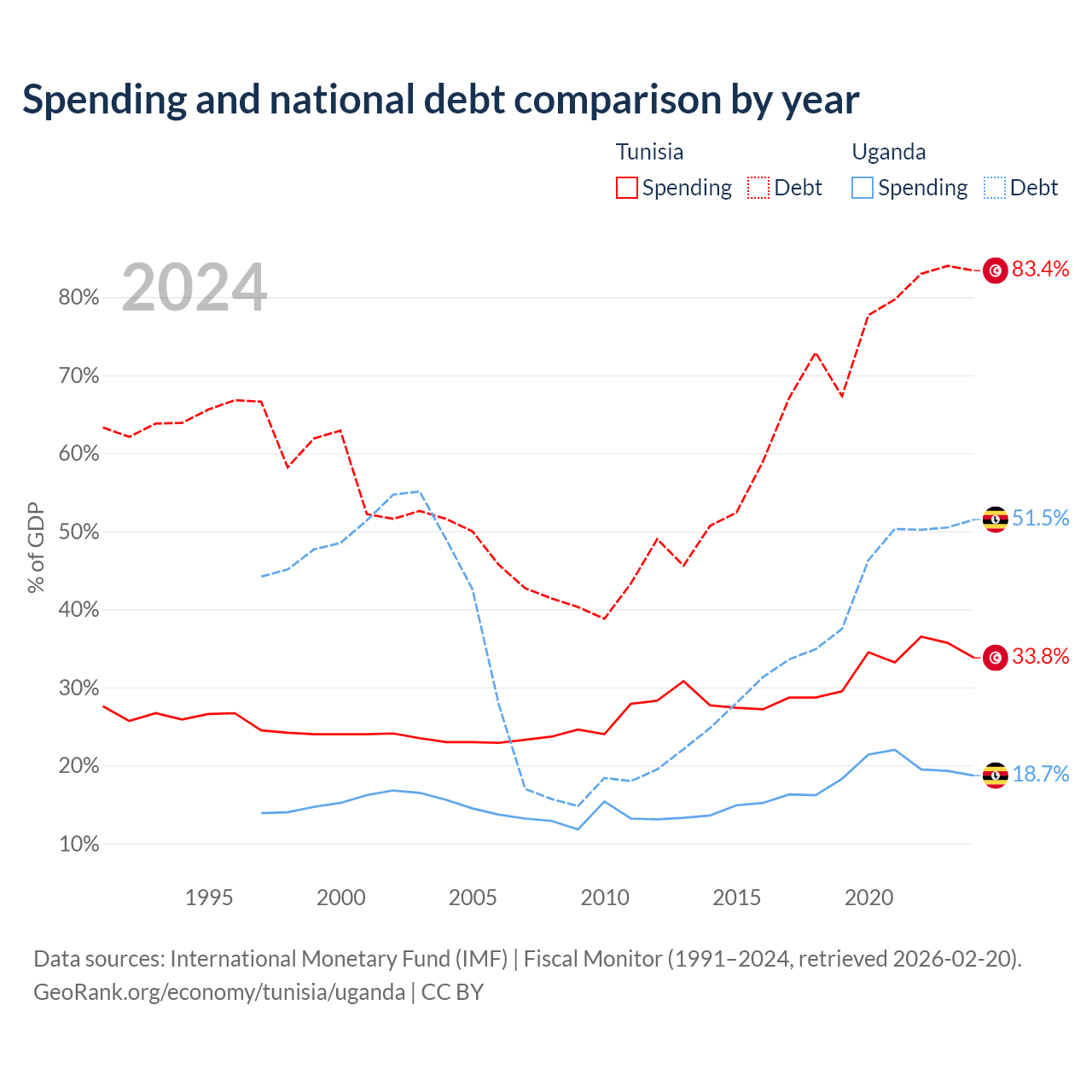 Tunisia has $42.8B in government debt (83.4% of GDP), compared to $27.8B (51.5% of GDP) in Uganda.