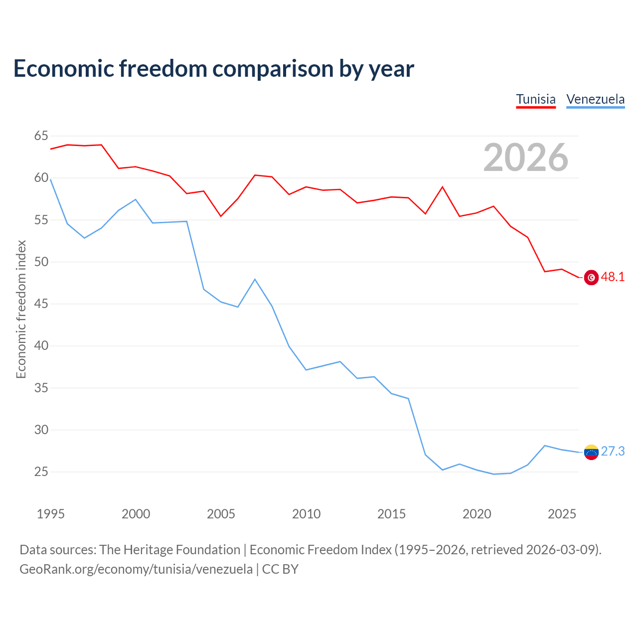 Data sources: The Heritage Foundation | Economic Freedom Index (1995–2026, retrieved 2026-03-09).