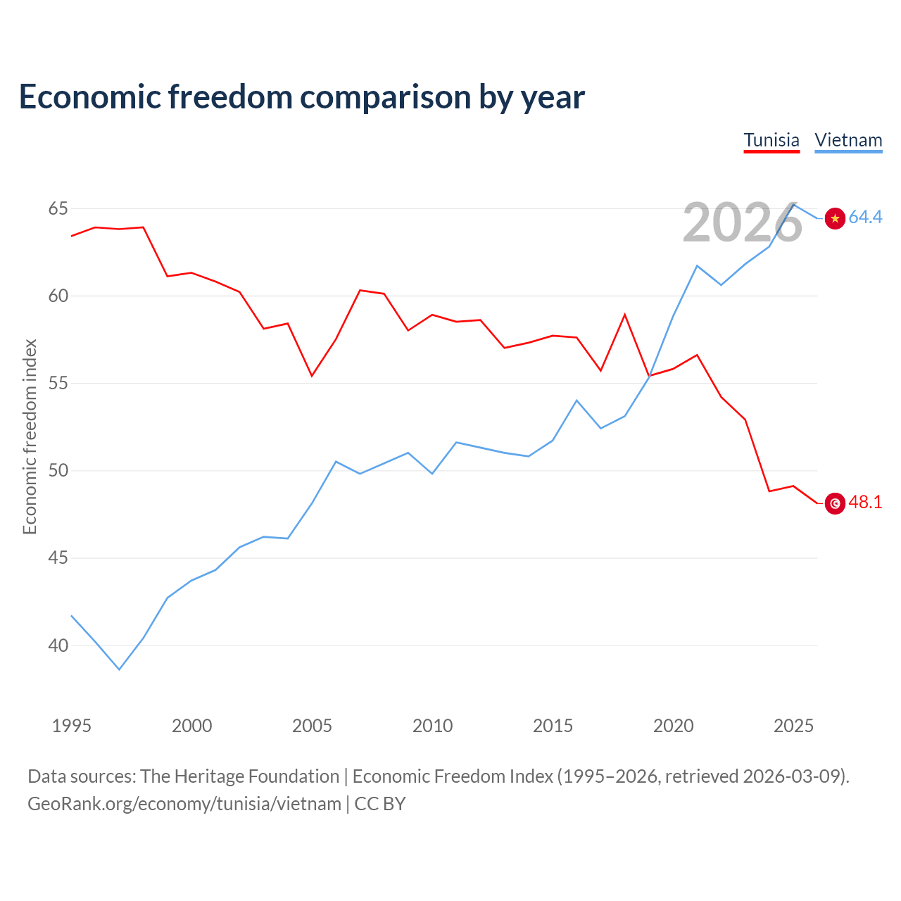 The Economic Freedom Index for Tunisia is 48.1, ranking 172/197, compared to 64.4 for Vietnam, ranking 73/197. The chart above displays a comparison of annual changes in economic freedom indexes.