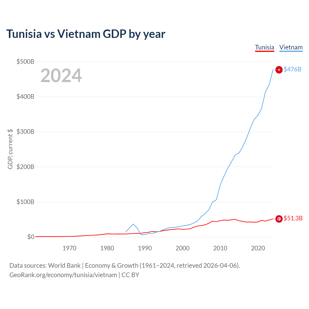 Tunisia has a GDP of $51.3B compared to $476B for Vietnam, ranking 93/197 and 33/197 by economy size, respectively.