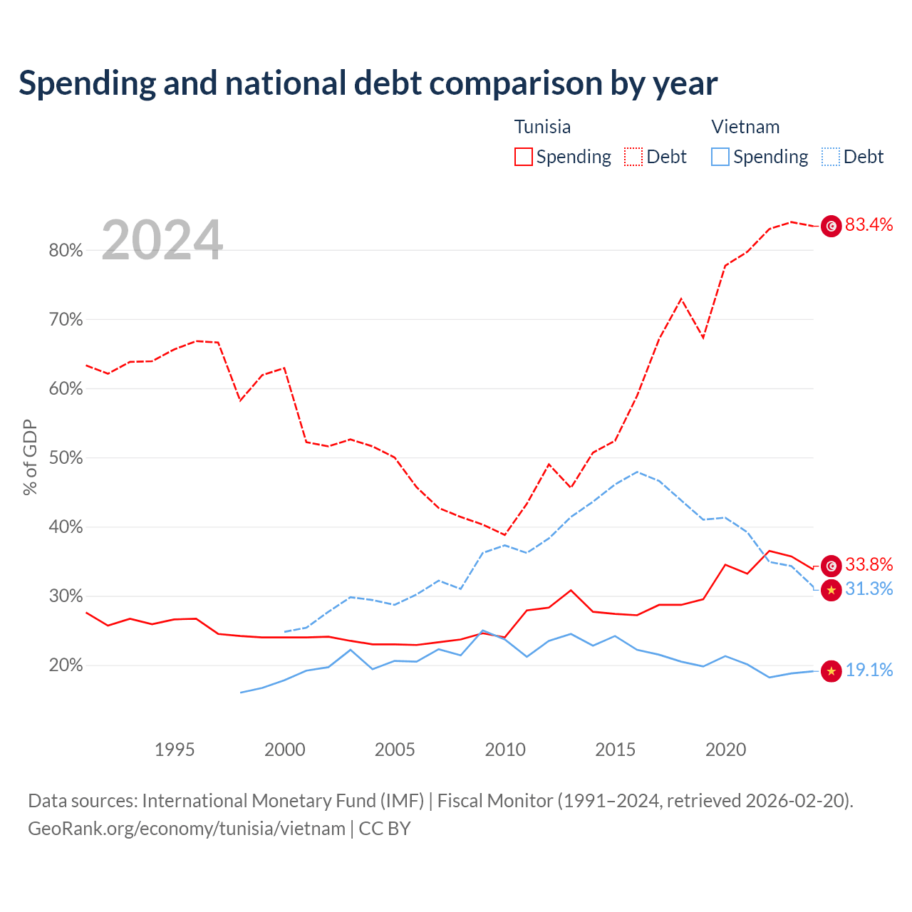 Tunisia has $42.8B in government debt (83.4% of GDP), compared to $149B (31.3% of GDP) in Vietnam.
