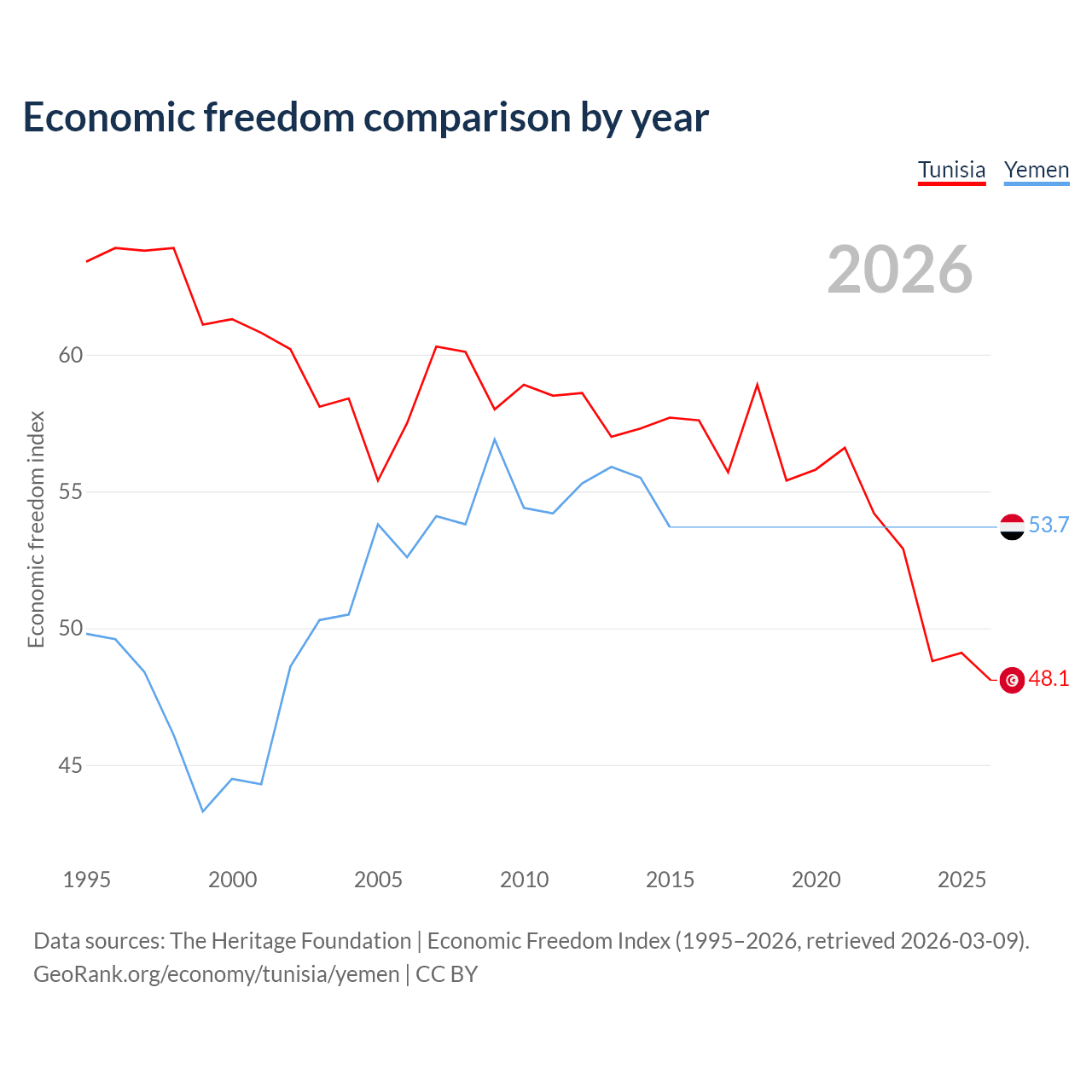 The Economic Freedom Index for Tunisia is 48.1, ranking 172/197, compared to 53.7 for Yemen, ranking 138/197. The chart above displays a comparison of annual changes in economic freedom indexes.