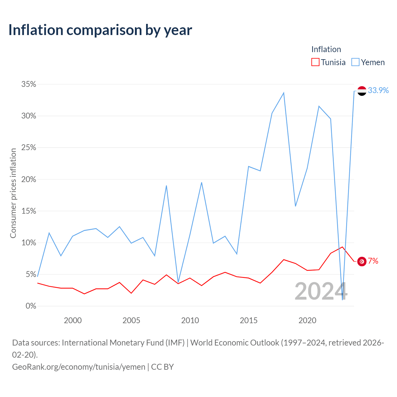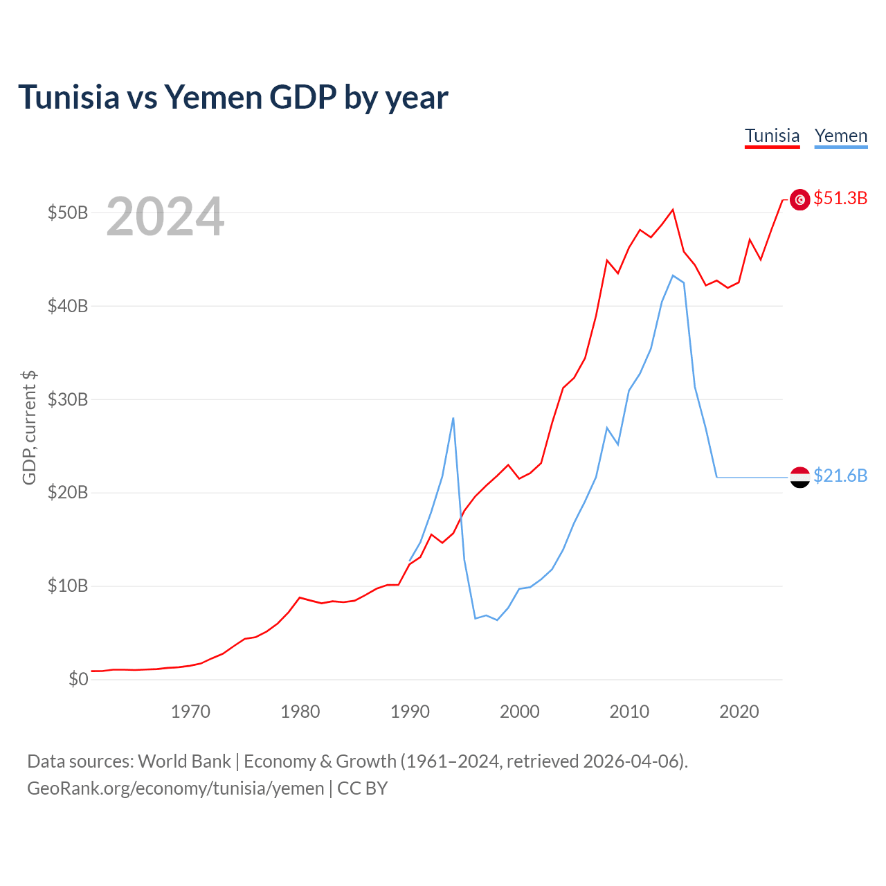 Tunisia has a GDP of $51.3B compared to $21.6B for Yemen, ranking 93/197 and 125/197 by economy size, respectively.
