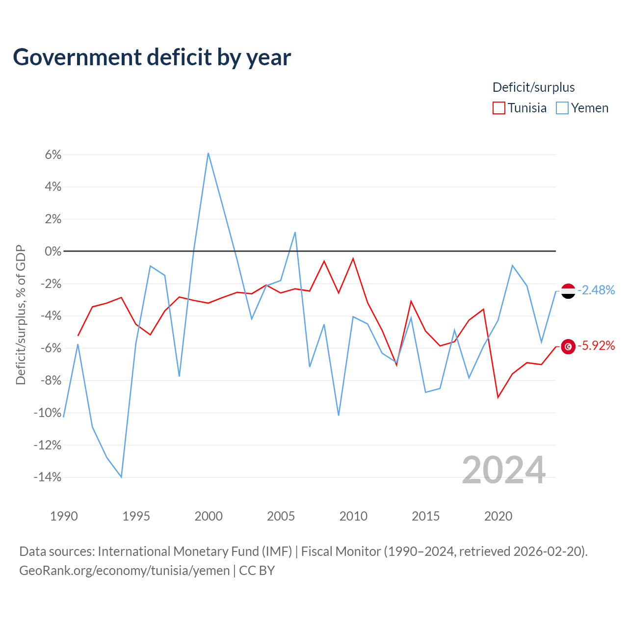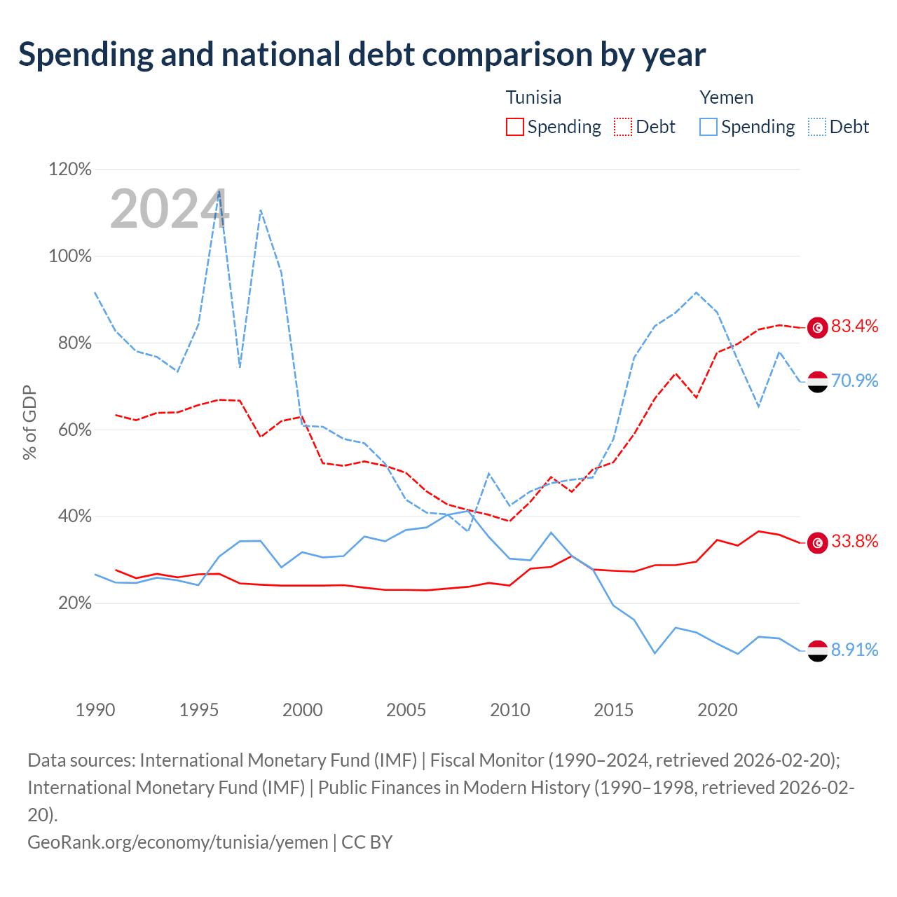 Tunisia has $42.8B in government debt (83.4% of GDP), compared to $18.8B (70.9% of GDP) in Yemen.