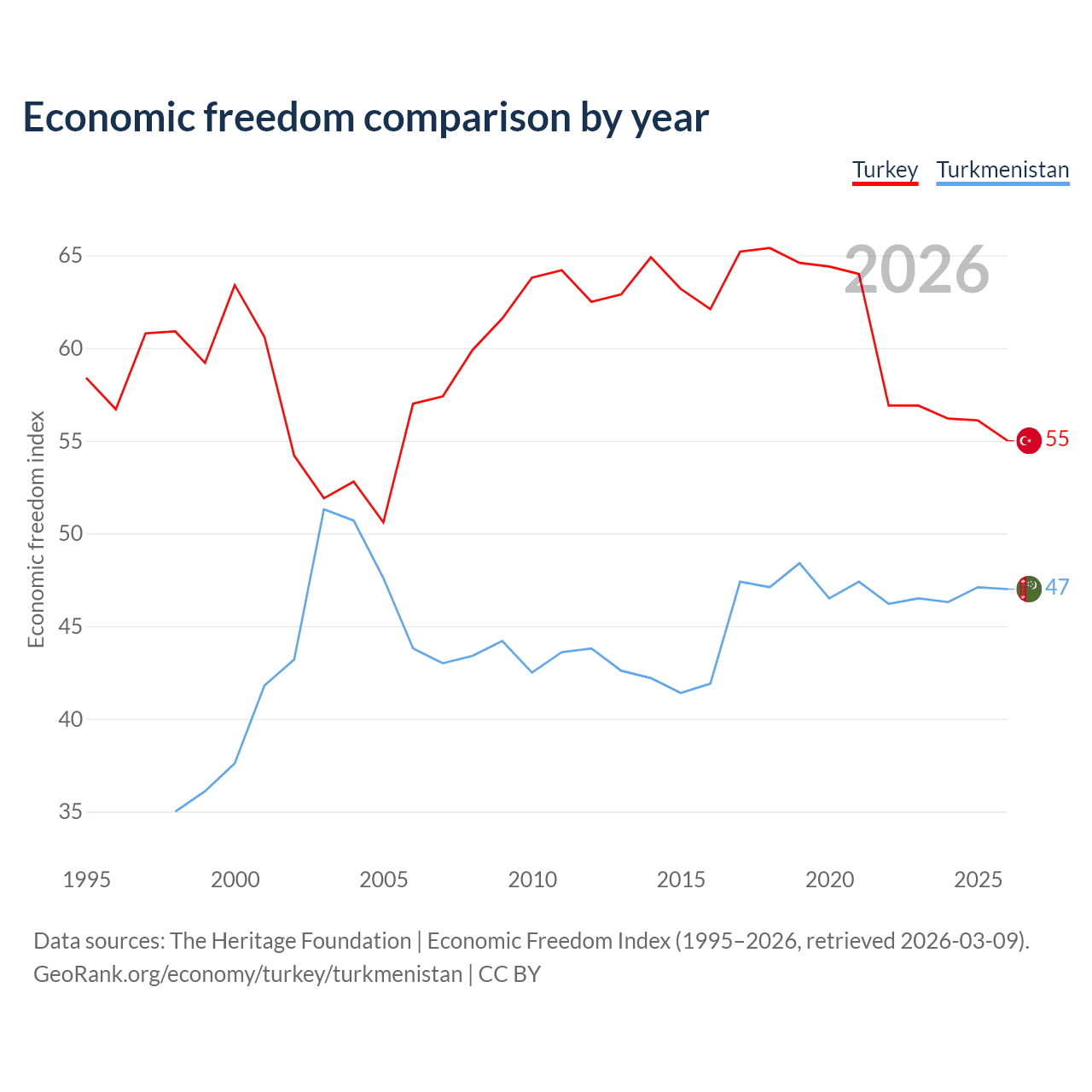 The Economic Freedom Index for Turkey is 55, ranking 129/197, compared to 47 for Turkmenistan, ranking 177/197. The chart above displays a comparison of annual changes in economic freedom indexes.