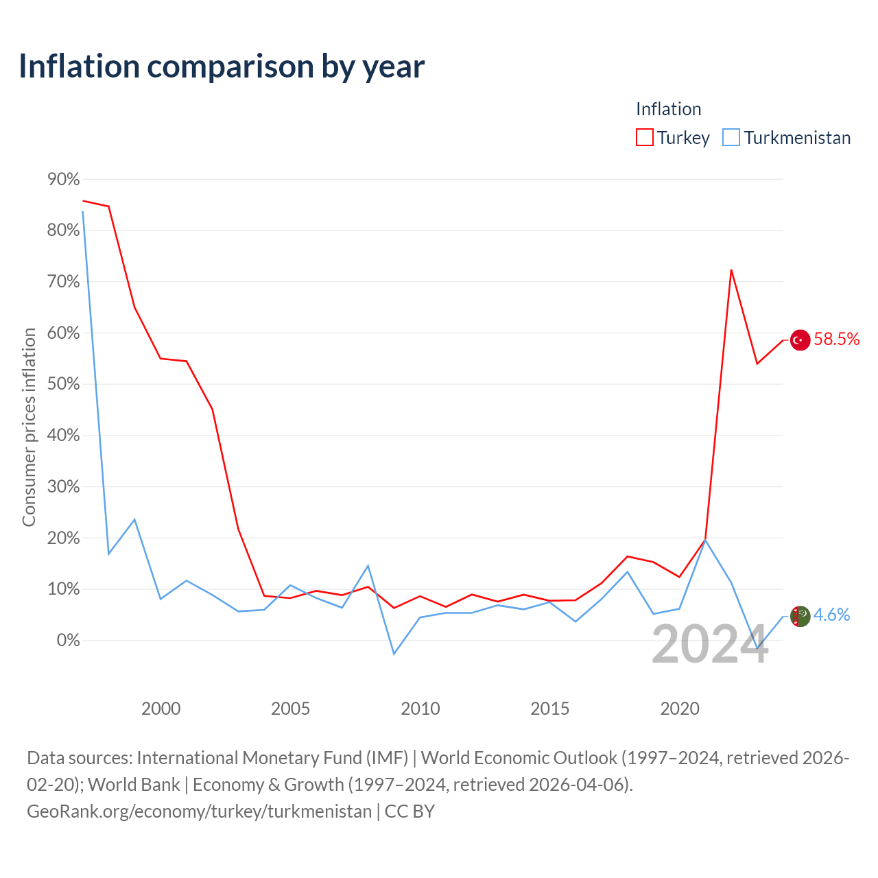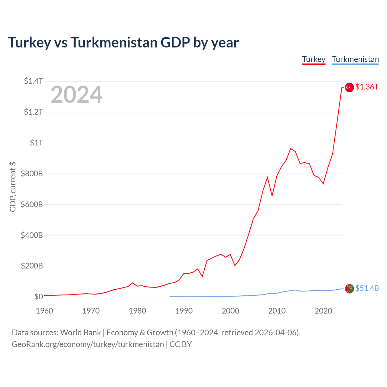 Turkey has a GDP of $1.36T compared to $51.4B for Turkmenistan, ranking 17/197 and 92/197 by economy size, respectively.