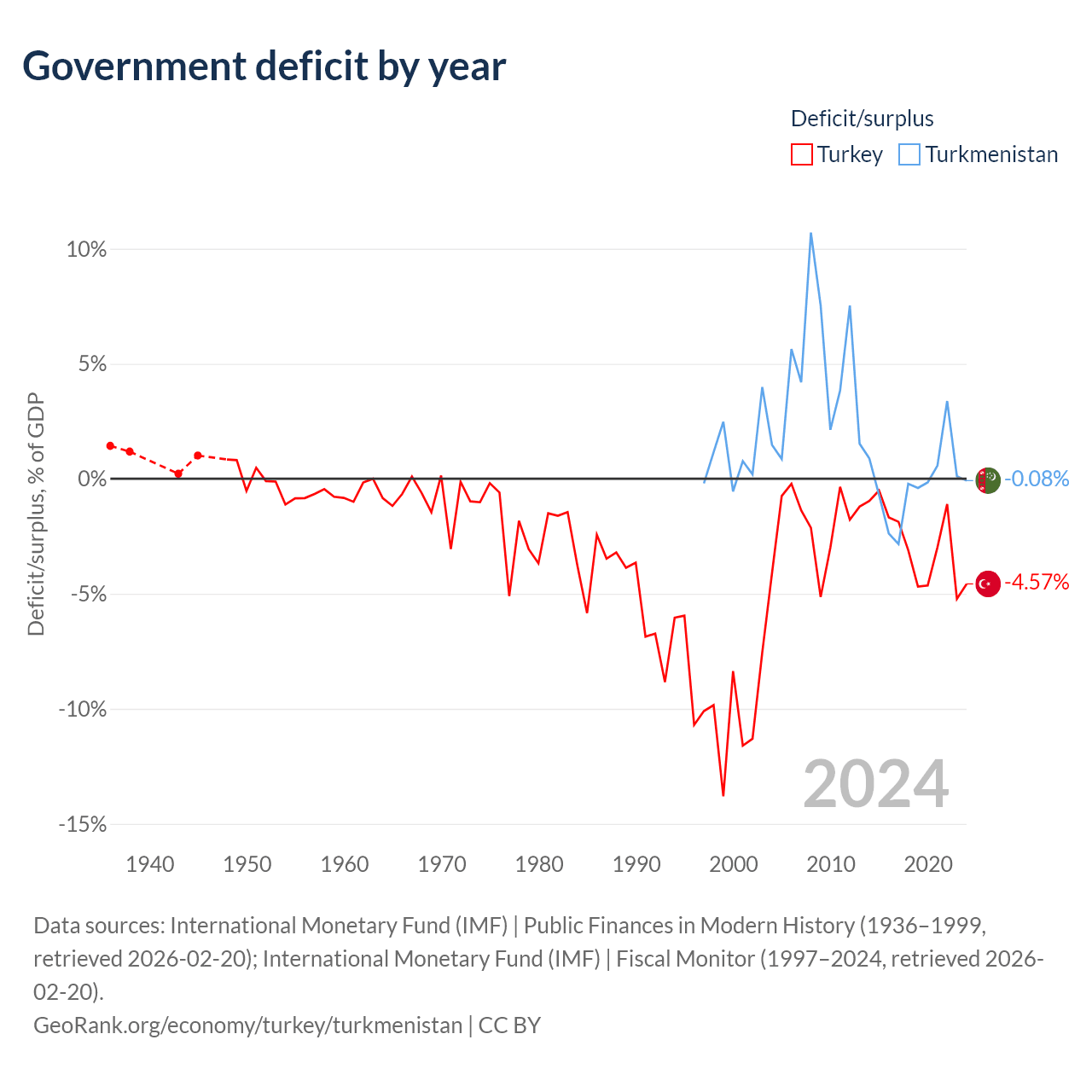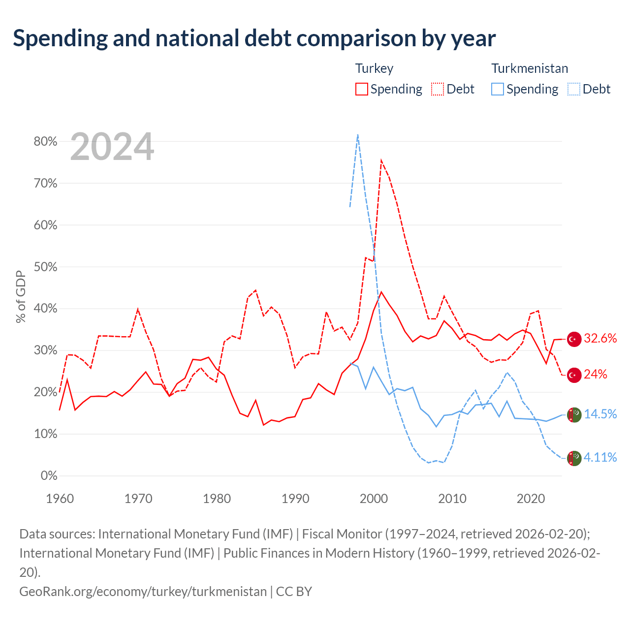 Turkey has $327B in government debt (24% of GDP), compared to $2.11B (4.11% of GDP) in Turkmenistan.