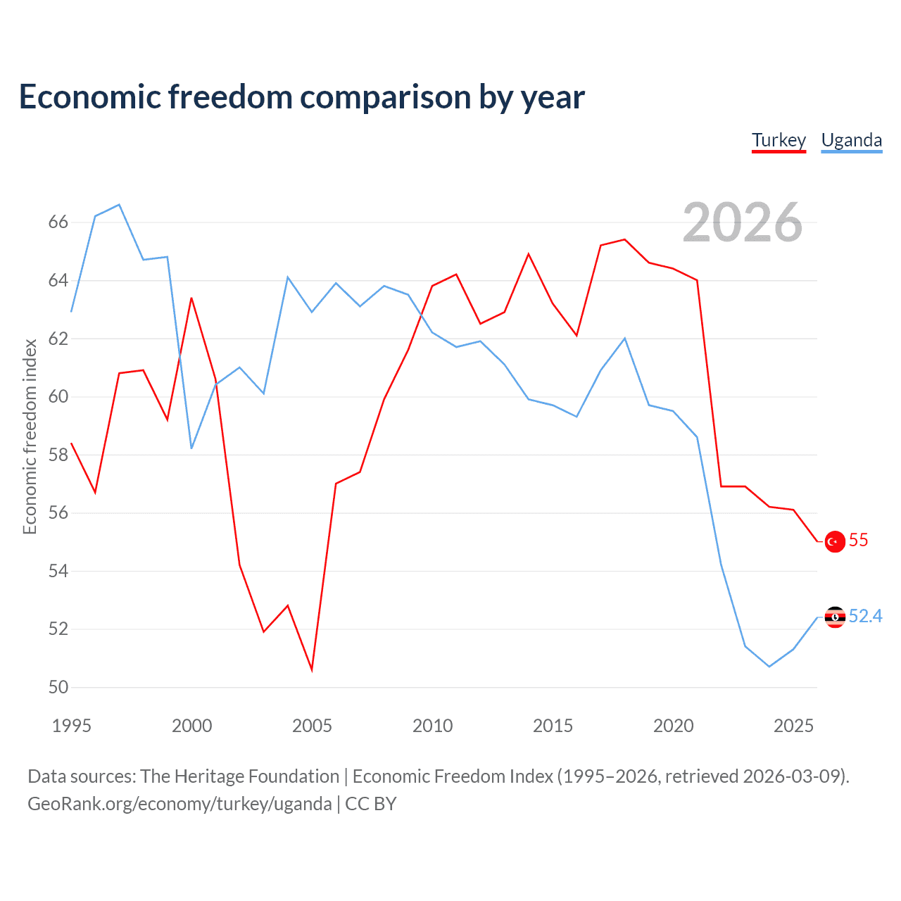 The Economic Freedom Index for Turkey is 55, ranking 129/197, compared to 52.4 for Uganda, ranking 149/197. The chart above displays a comparison of annual changes in economic freedom indexes.