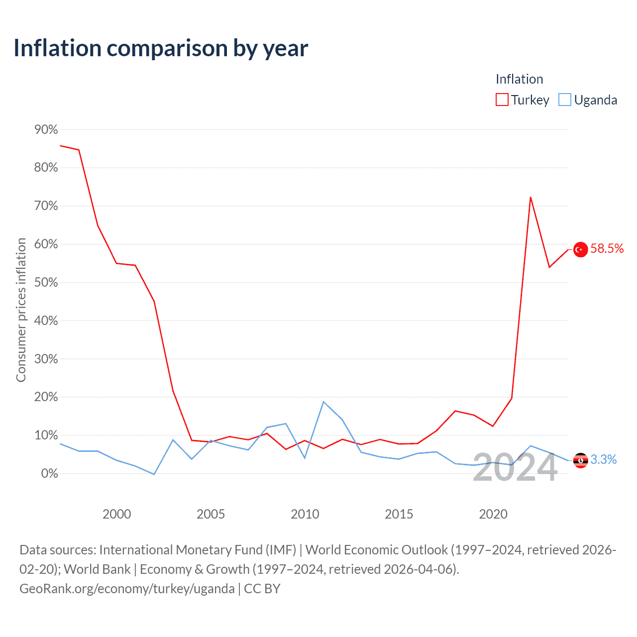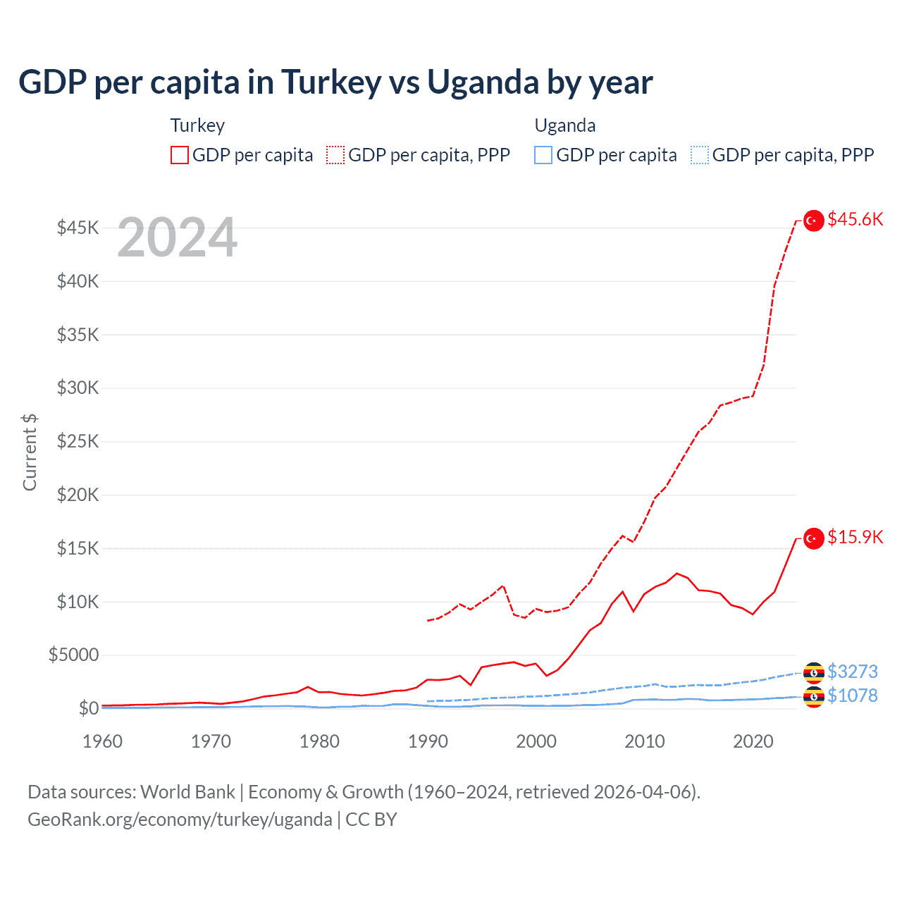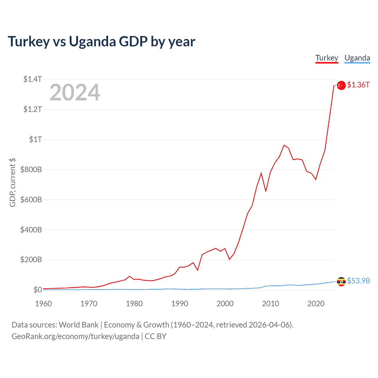Turkey has a GDP of $1.36T compared to $53.9B for Uganda, ranking 17/197 and 89/197 by economy size, respectively.