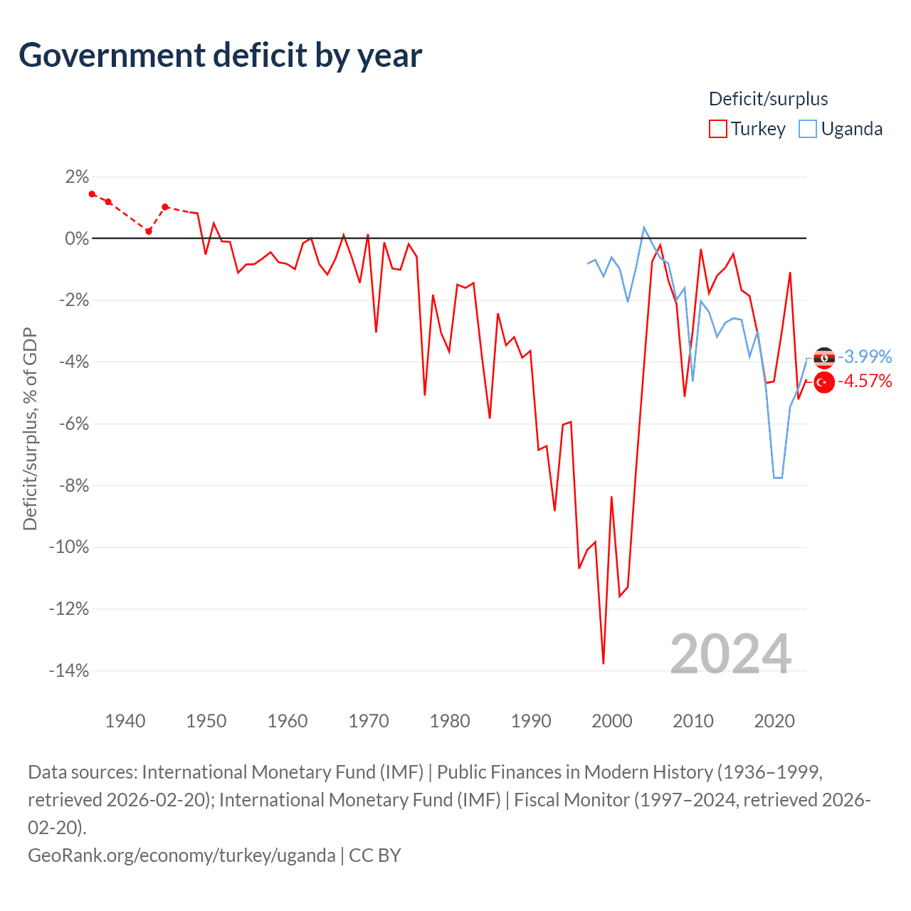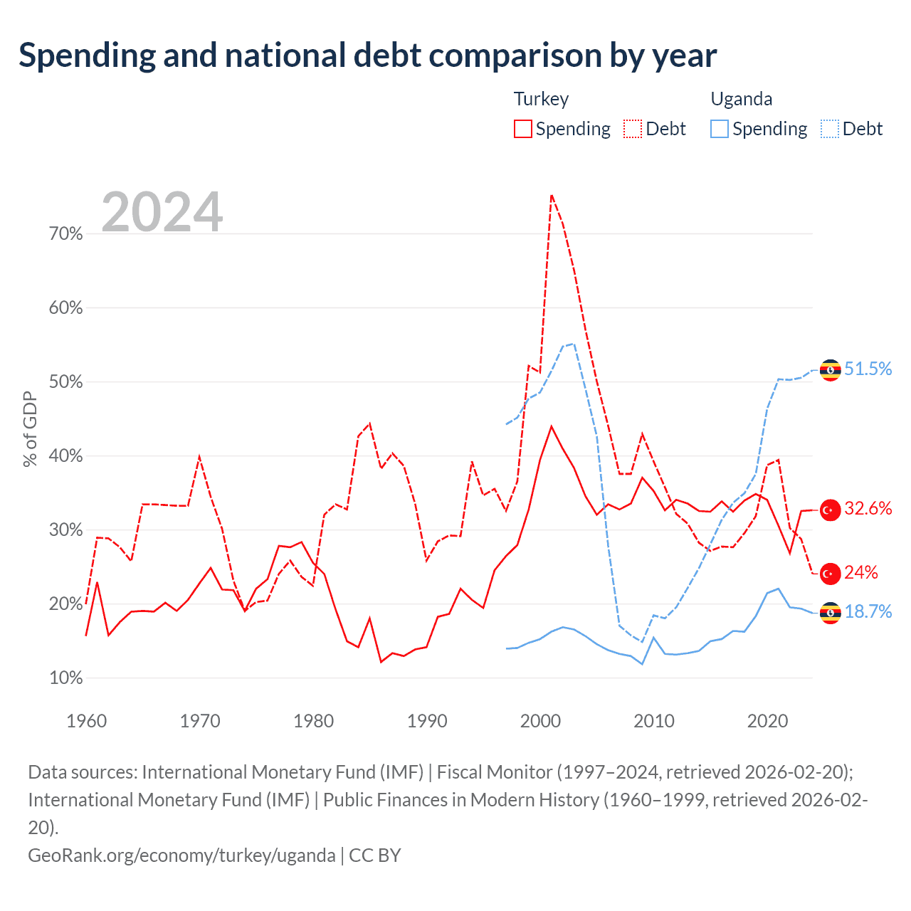 Turkey has $327B in government debt (24% of GDP), compared to $27.8B (51.5% of GDP) in Uganda.