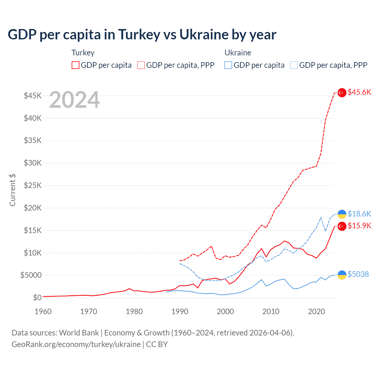GDP per capita in Turkey vs Ukraine by year