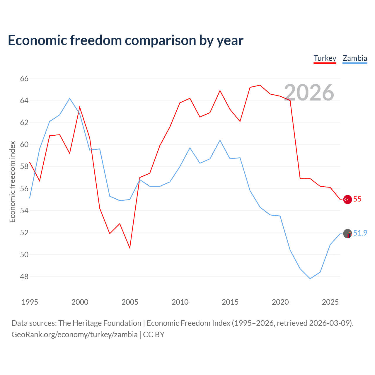 The Economic Freedom Index for Turkey is 55, ranking 129/197, compared to 51.9 for Zambia, ranking 152/197. The chart above displays a comparison of annual changes in economic freedom indexes.