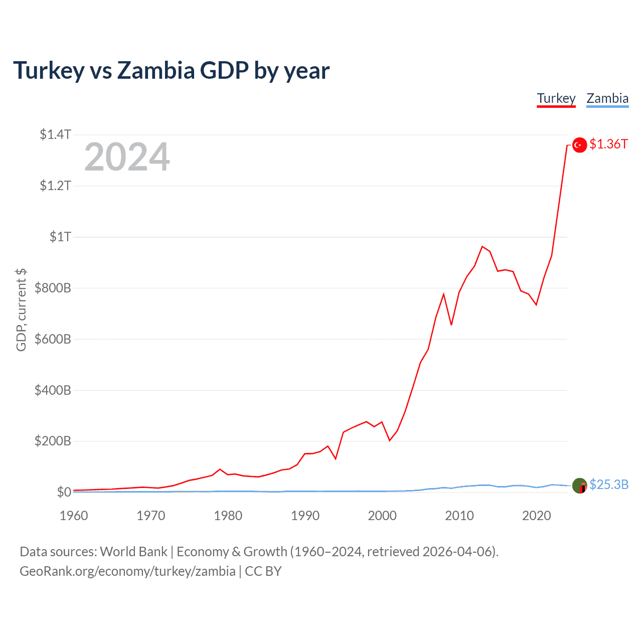 Turkey has a GDP of $1.36T compared to $25.3B for Zambia, ranking 17/197 and 116/197 by economy size, respectively.