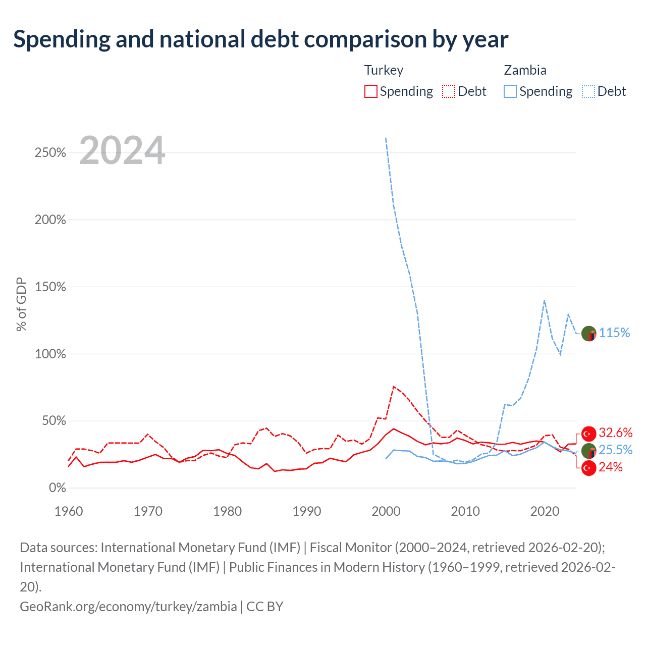 Turkey has $327B in government debt (24% of GDP), compared to $29.1B (114.9% of GDP) in Zambia.