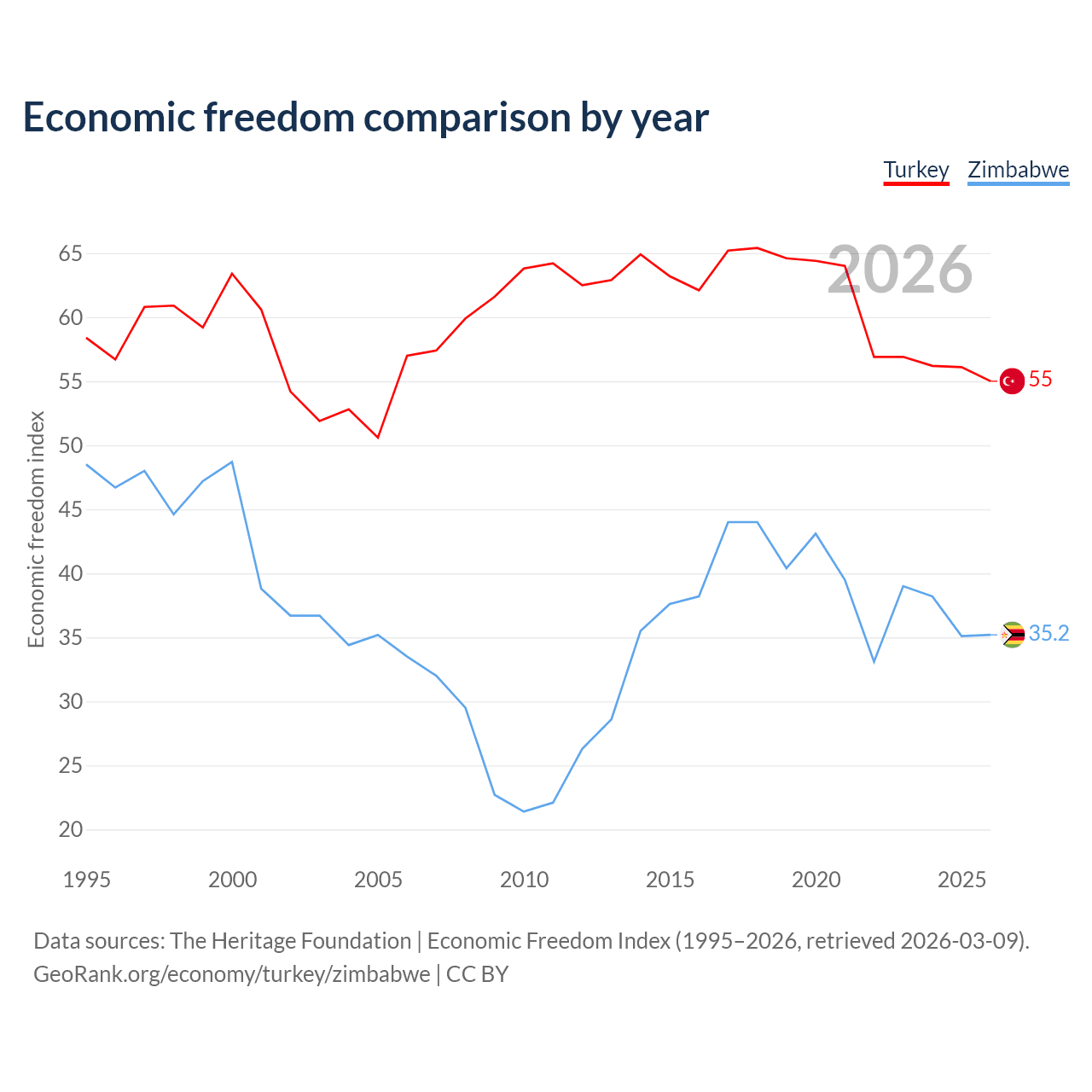 The Economic Freedom Index for Turkey is 55, ranking 129/197, compared to 35.2 for Zimbabwe, ranking 190/197. The chart above displays a comparison of annual changes in economic freedom indexes.