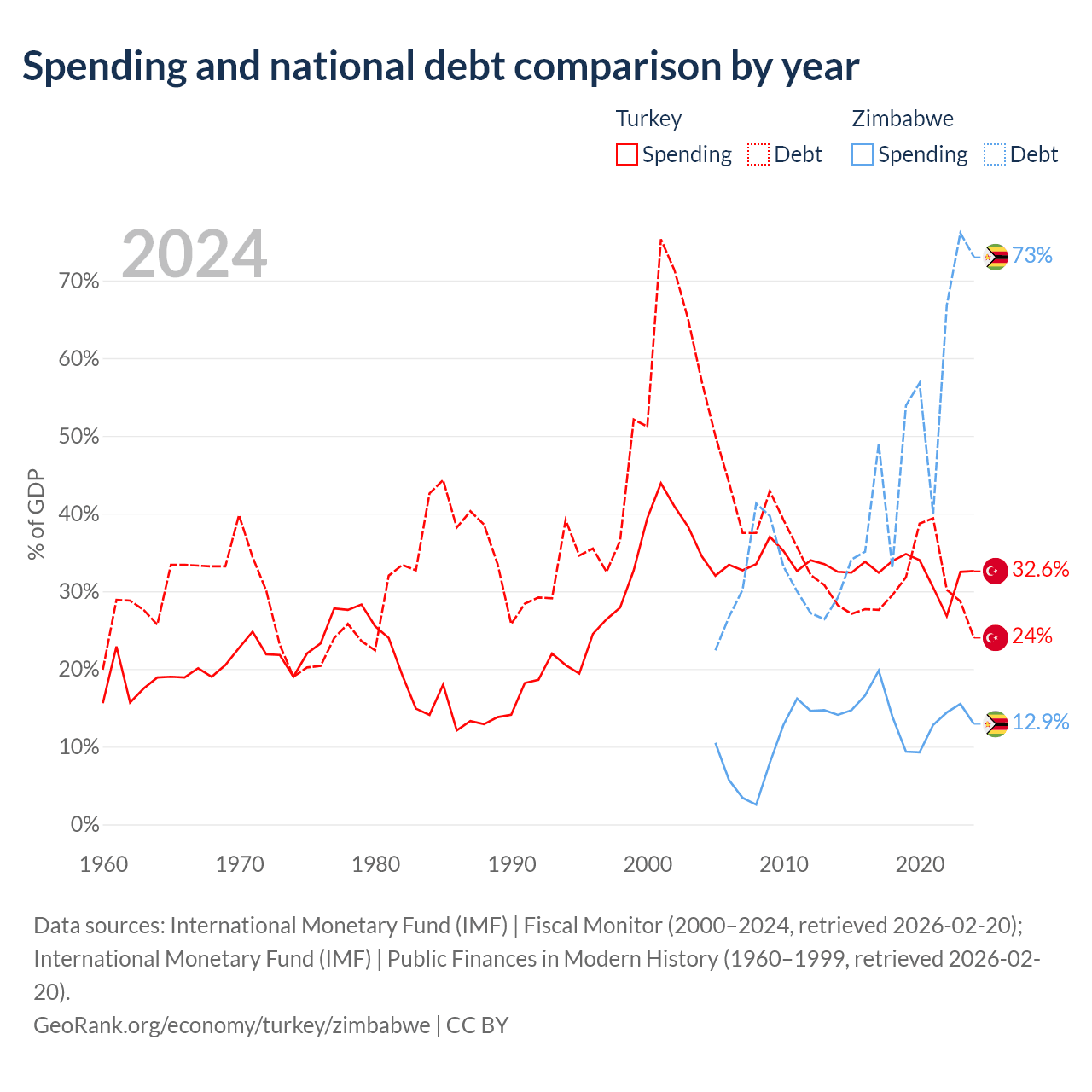 Turkey has $327B in government debt (24% of GDP), compared to $30.3B (73% of GDP) in Zimbabwe.