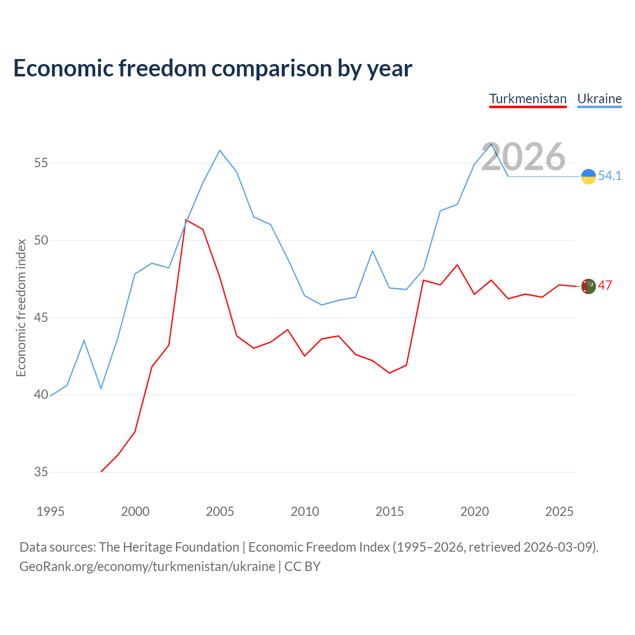 The Economic Freedom Index for Turkmenistan is 47, ranking 177/197, compared to 54.1 for Ukraine, ranking 135/197. The chart above displays a comparison of annual changes in economic freedom indexes.