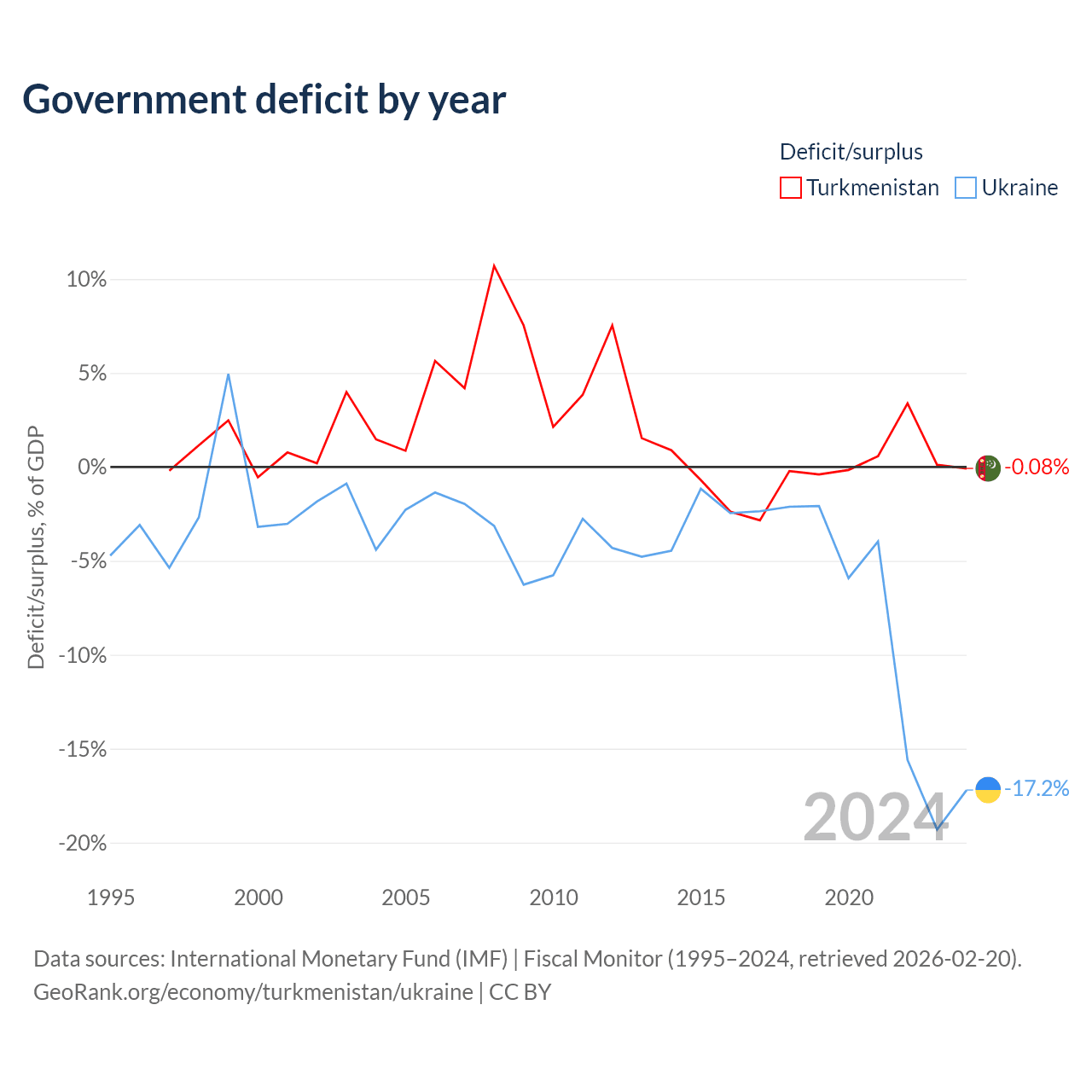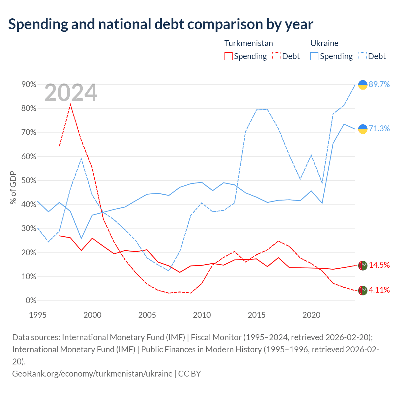 Turkmenistan has $2.11B in government debt (4.11% of GDP), compared to $171B (89.7% of GDP) in Ukraine.