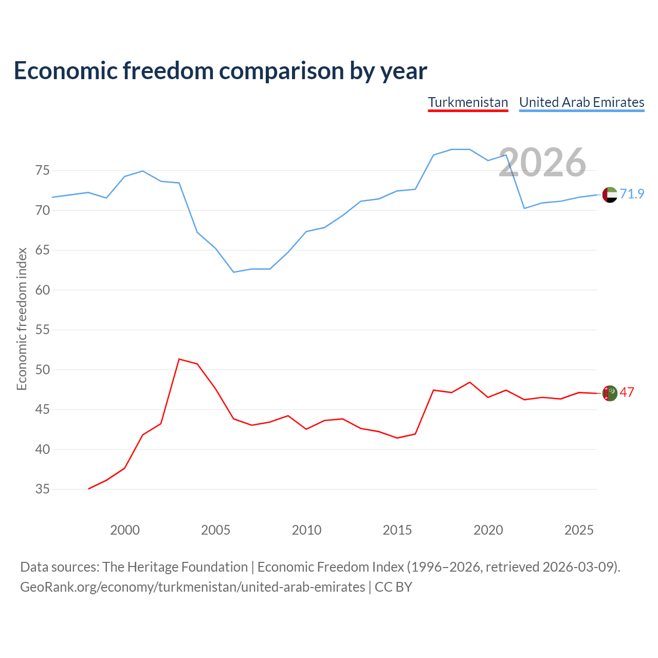Data sources: The Heritage Foundation | Economic Freedom Index (1996–2026, retrieved 2026-03-09).