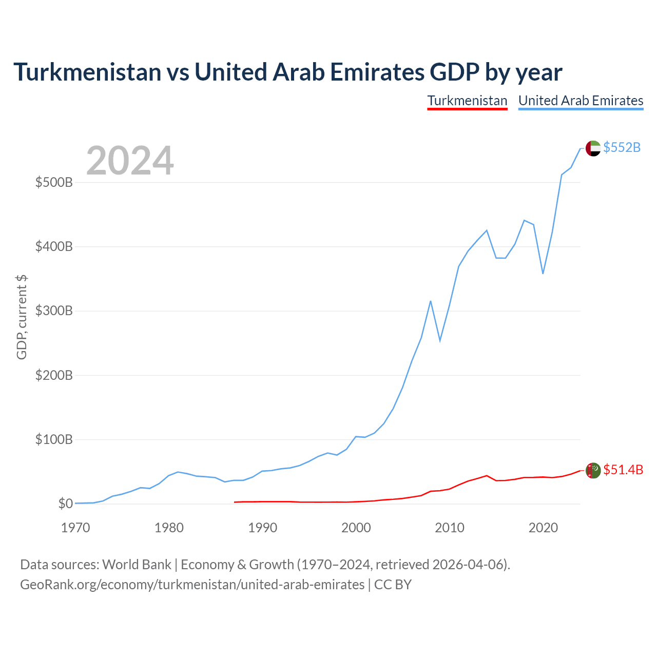 Turkmenistan has a GDP of $51.4B compared to $552B for the United Arab Emirates, ranking 92/197 and 27/197 by economy size, respectively.