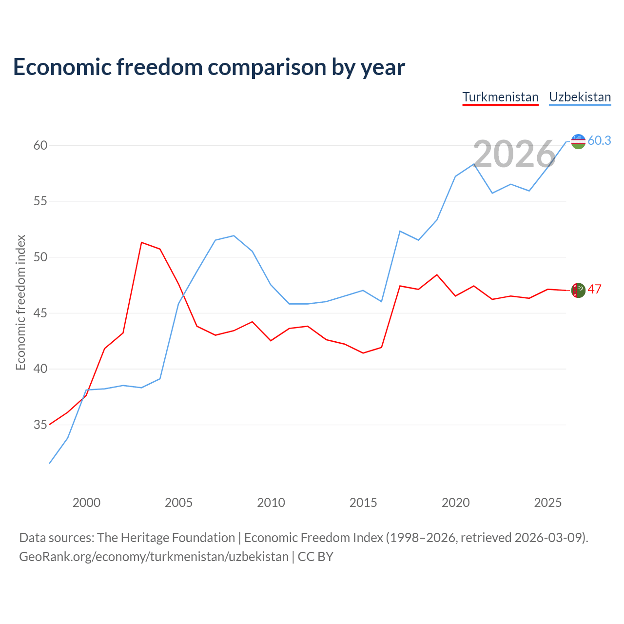 The Economic Freedom Index for Turkmenistan is 47, ranking 177/197, compared to 60.3 for Uzbekistan, ranking 94/197. The chart above displays a comparison of annual changes in economic freedom indexes.