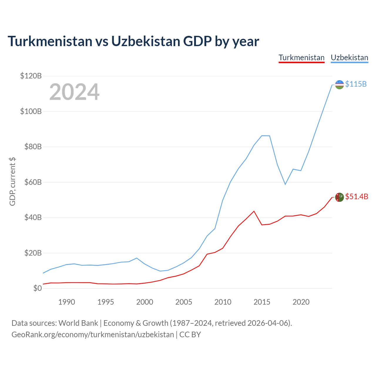 Turkmenistan has a GDP of $51.4B compared to $115B for Uzbekistan, ranking 92/197 and 66/197 by economy size, respectively.