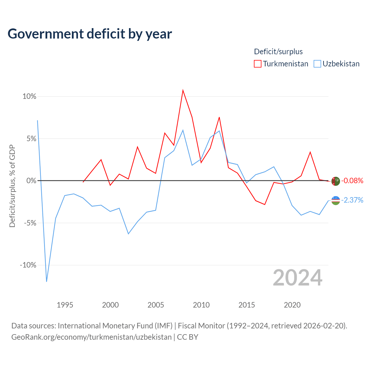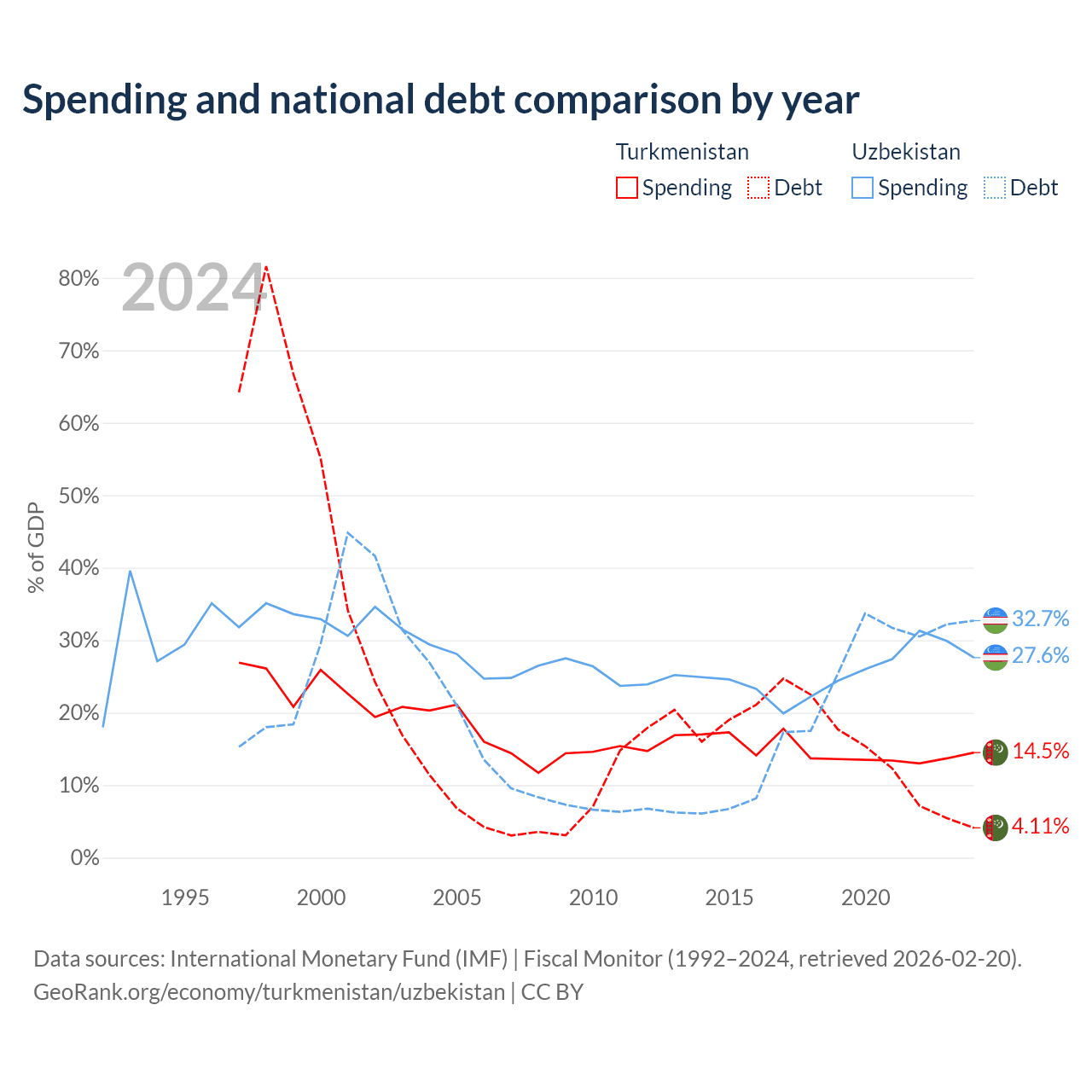Turkmenistan has $2.11B in government debt (4.11% of GDP), compared to $37.5B (32.7% of GDP) in Uzbekistan.