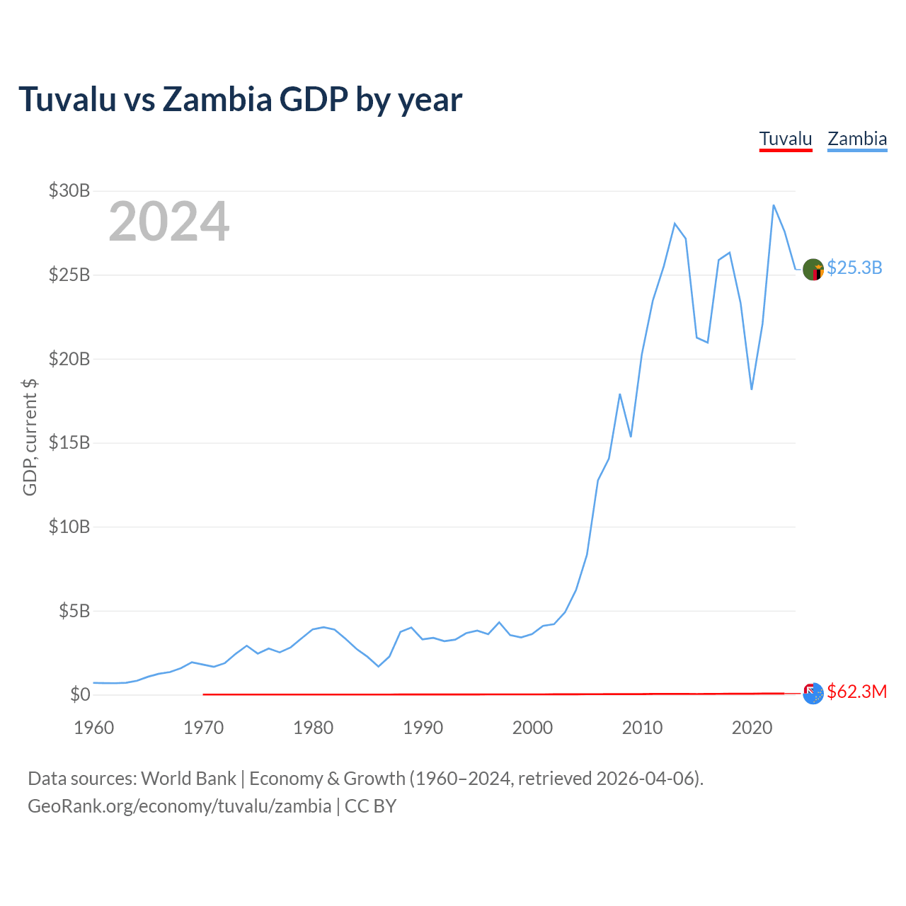 Tuvalu has a GDP of $62.3M compared to $25.3B for Zambia, ranking 196/197 and 116/197 by economy size, respectively.