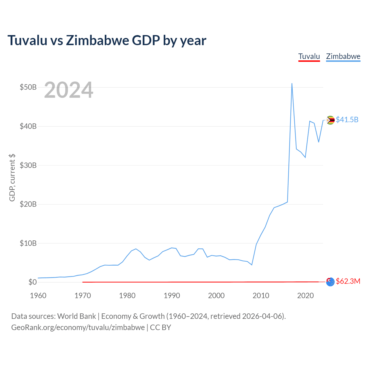Tuvalu has a GDP of $62.3M compared to $41.5B for Zimbabwe, ranking 196/197 and 102/197 by economy size, respectively.