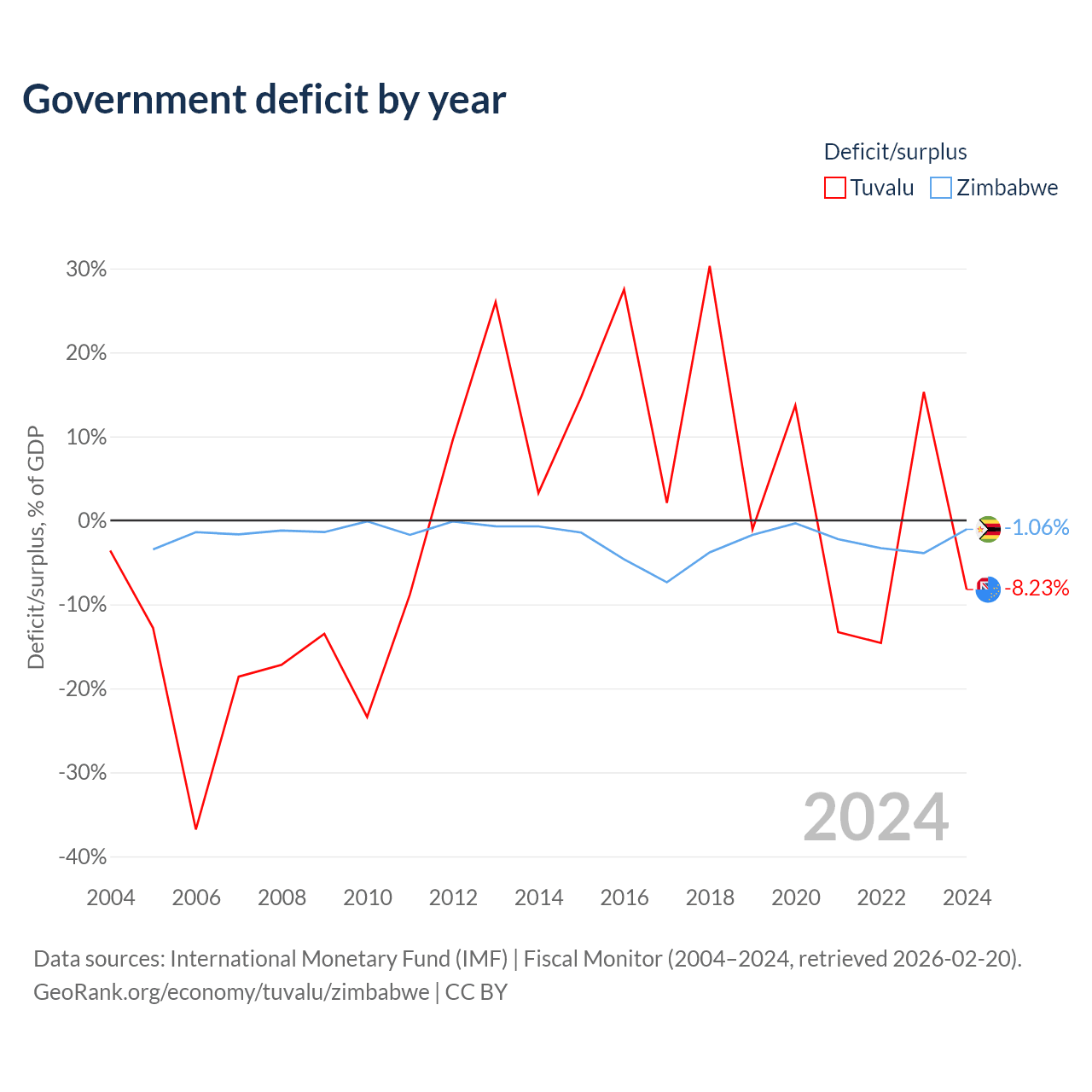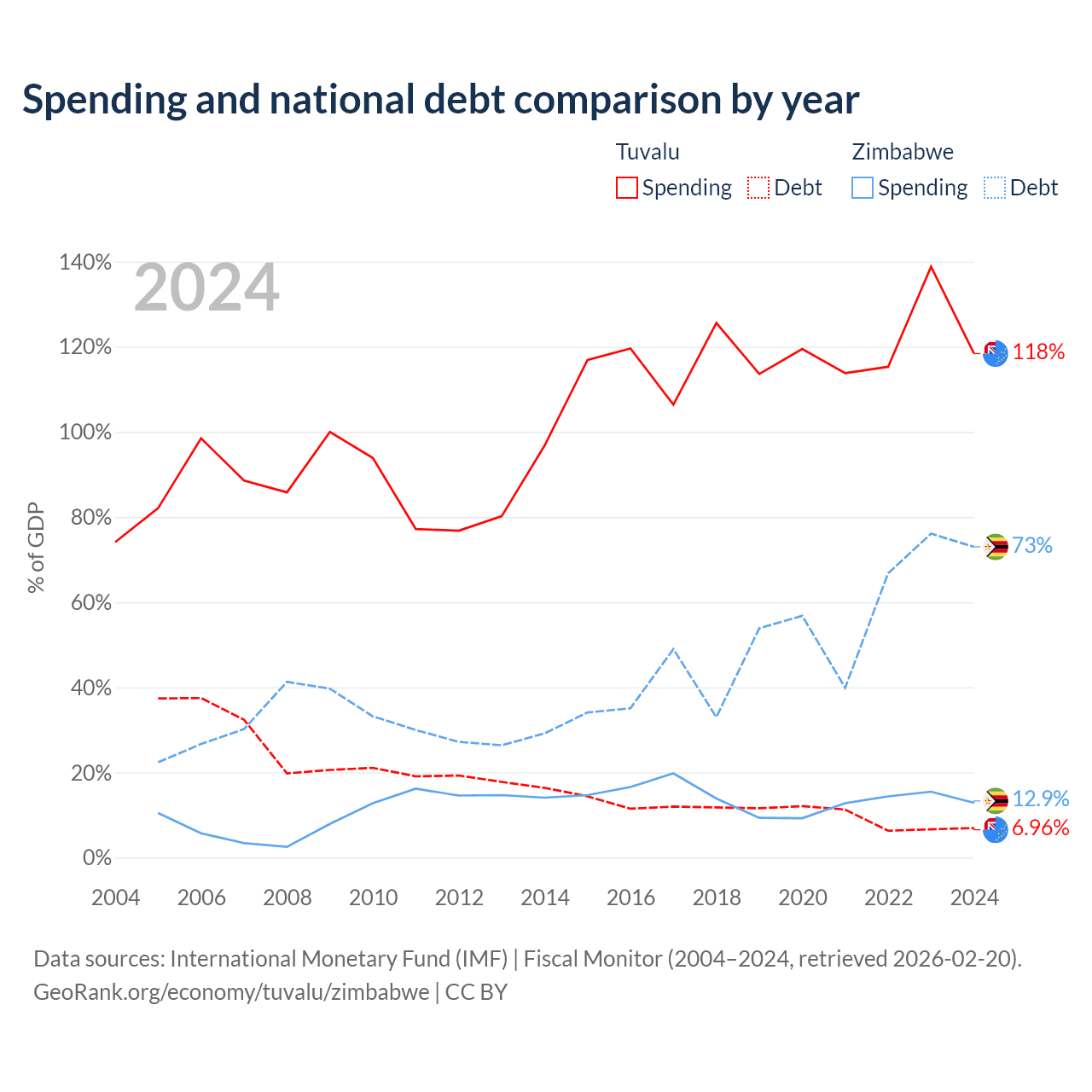 Tuvalu has $4.15M in government debt (6.96% of GDP), compared to $30.3B (73% of GDP) in Zimbabwe.