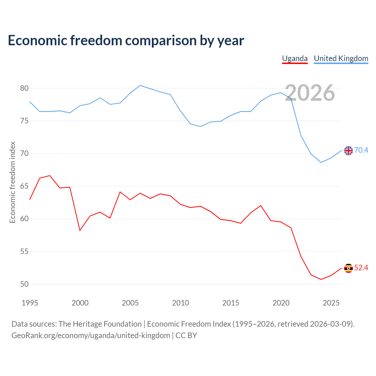 The Economic Freedom Index for Uganda is 52.4, ranking 149/197, compared to 70.4 for the United Kingdom, ranking 35/197. The chart above displays a comparison of annual changes in economic freedom indexes.