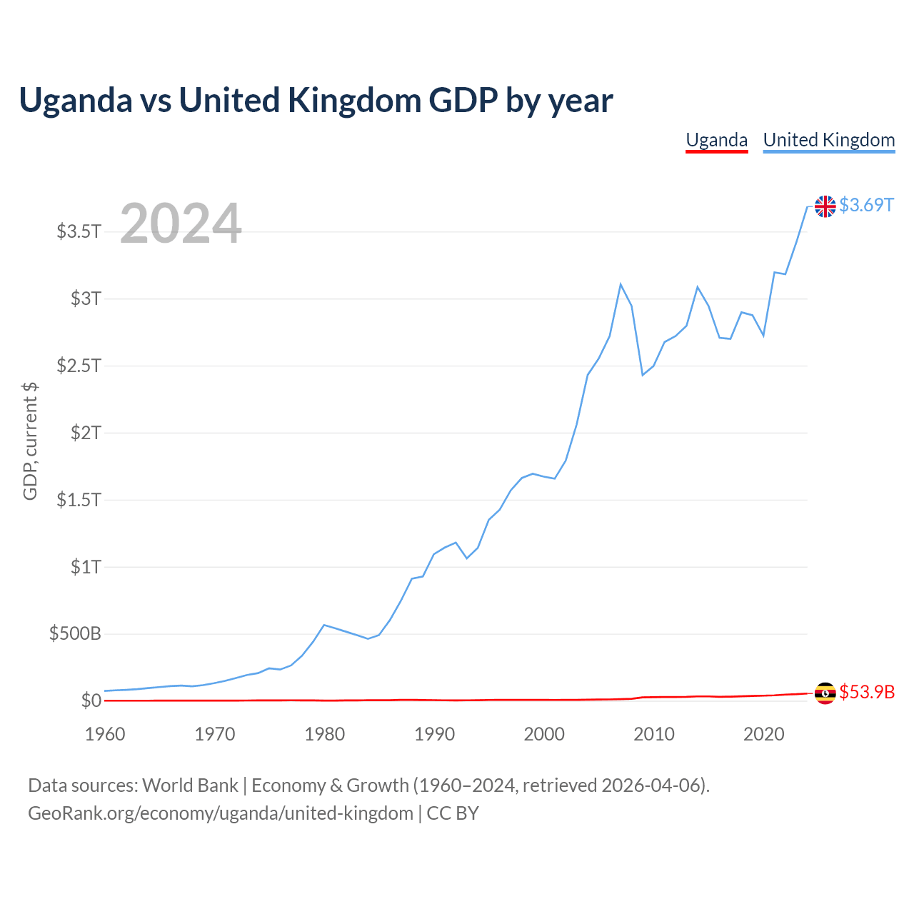 Uganda has a GDP of $53.9B compared to $3.69T for the United Kingdom, ranking 89/197 and 6/197 by economy size, respectively.