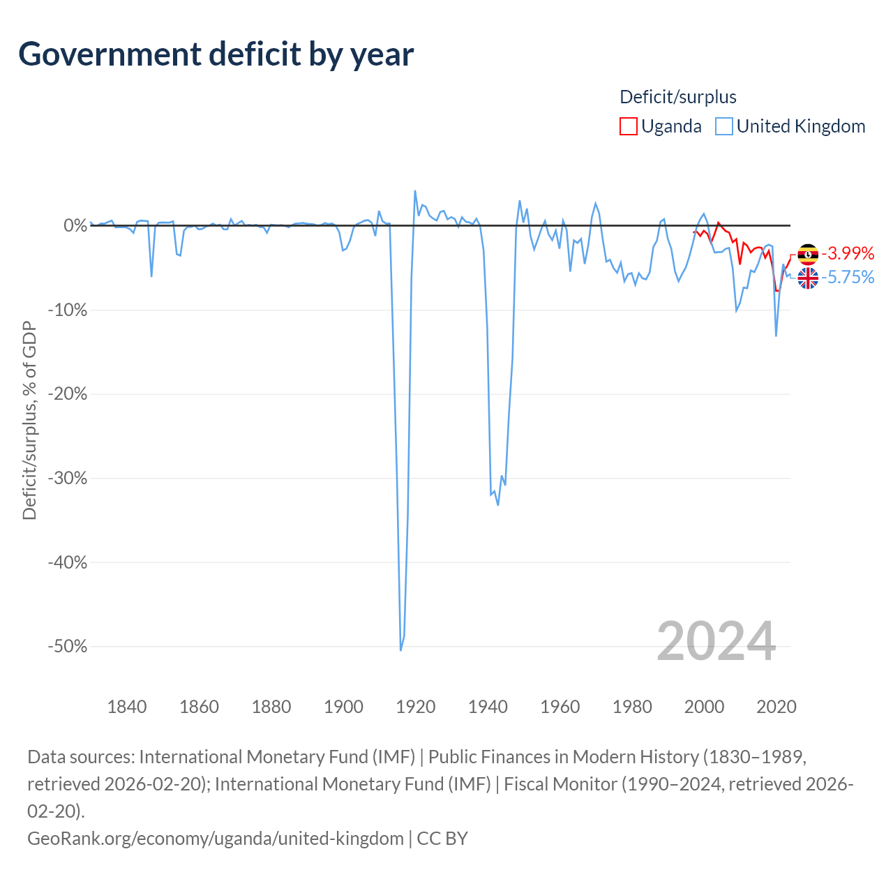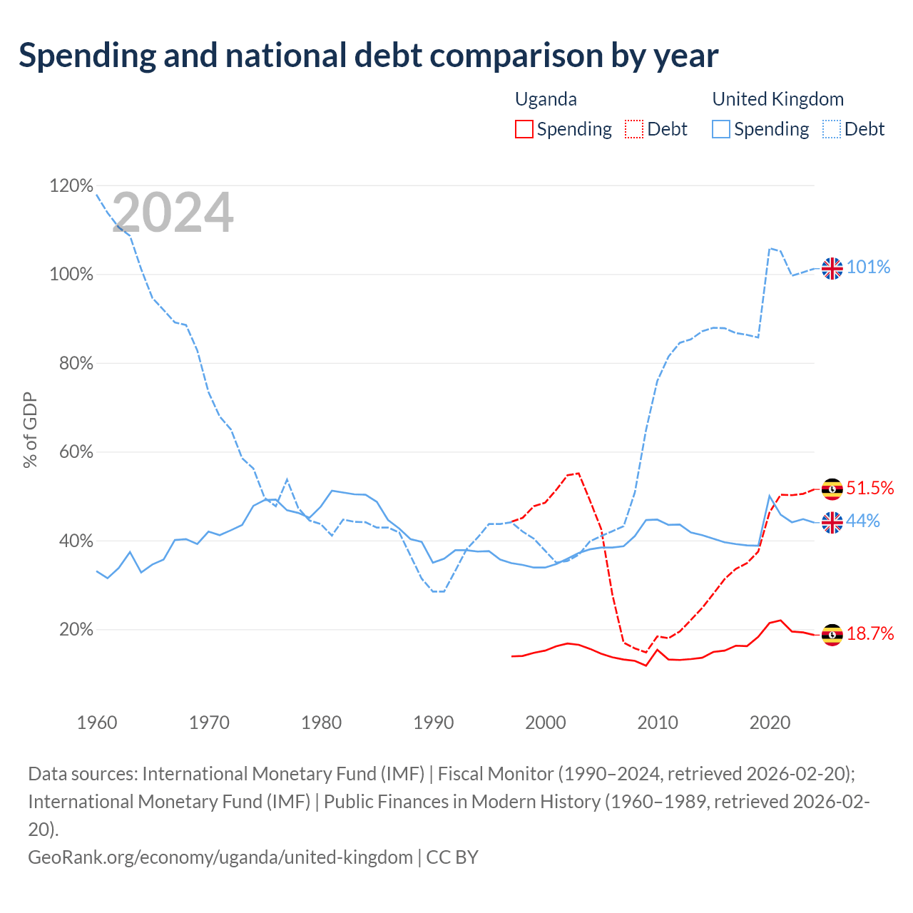 Uganda has $27.8B in government debt (51.5% of GDP), compared to $3.73T (101.2% of GDP) in the United Kingdom.