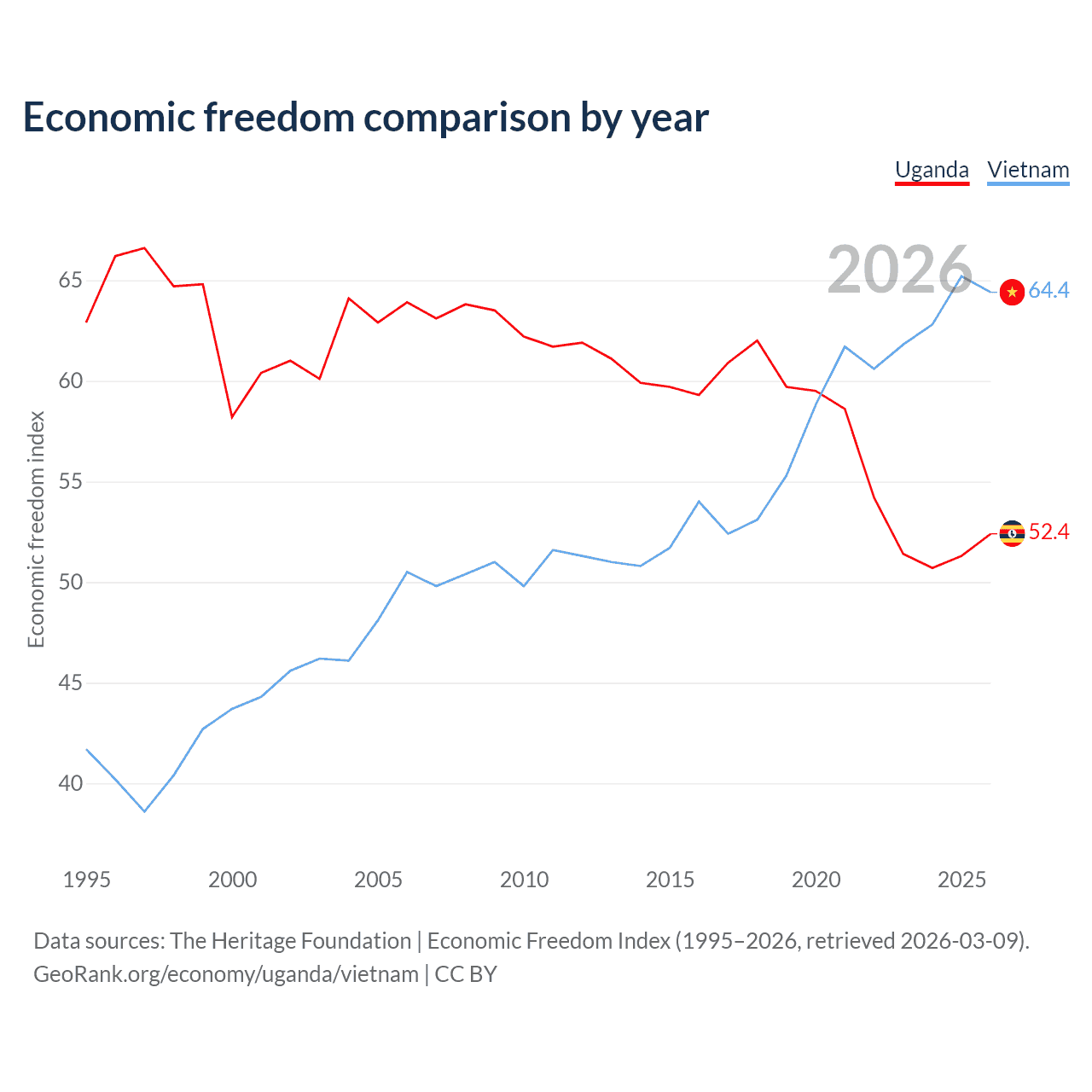 The Economic Freedom Index for Uganda is 52.4, ranking 149/197, compared to 64.4 for Vietnam, ranking 73/197. The chart above displays a comparison of annual changes in economic freedom indexes.