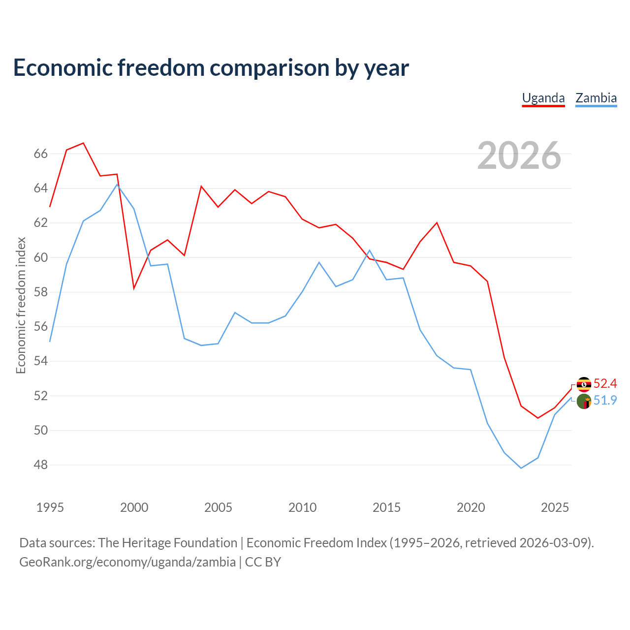 The Economic Freedom Index for Uganda is 52.4, ranking 149/197, compared to 51.9 for Zambia, ranking 152/197. The chart above displays a comparison of annual changes in economic freedom indexes.