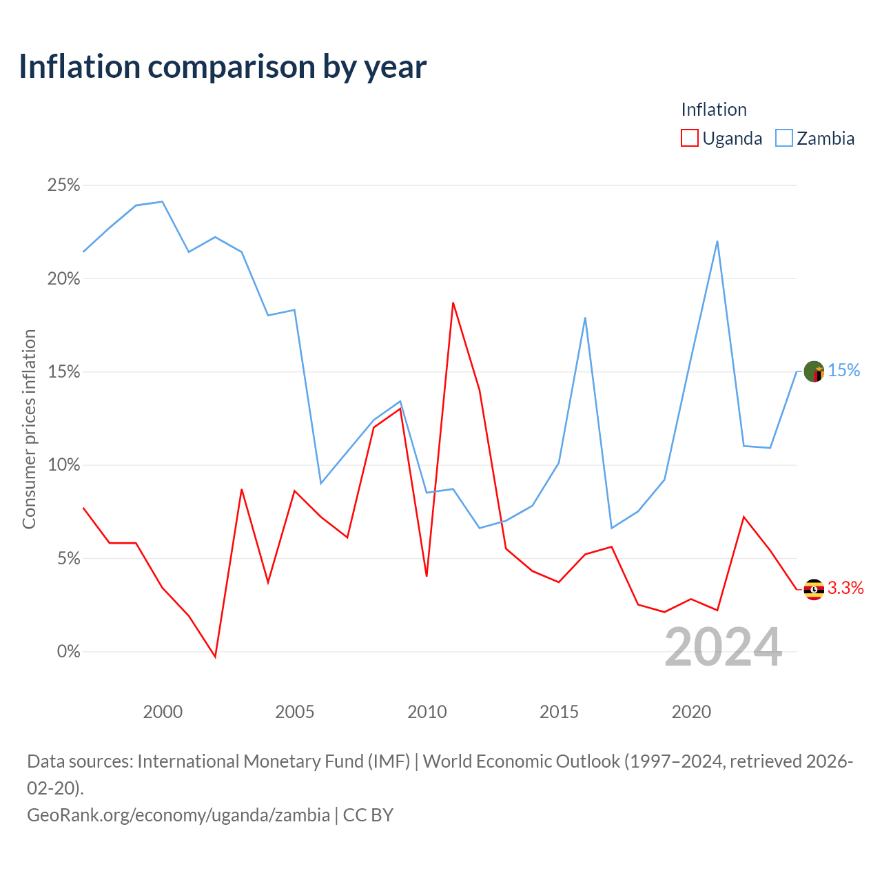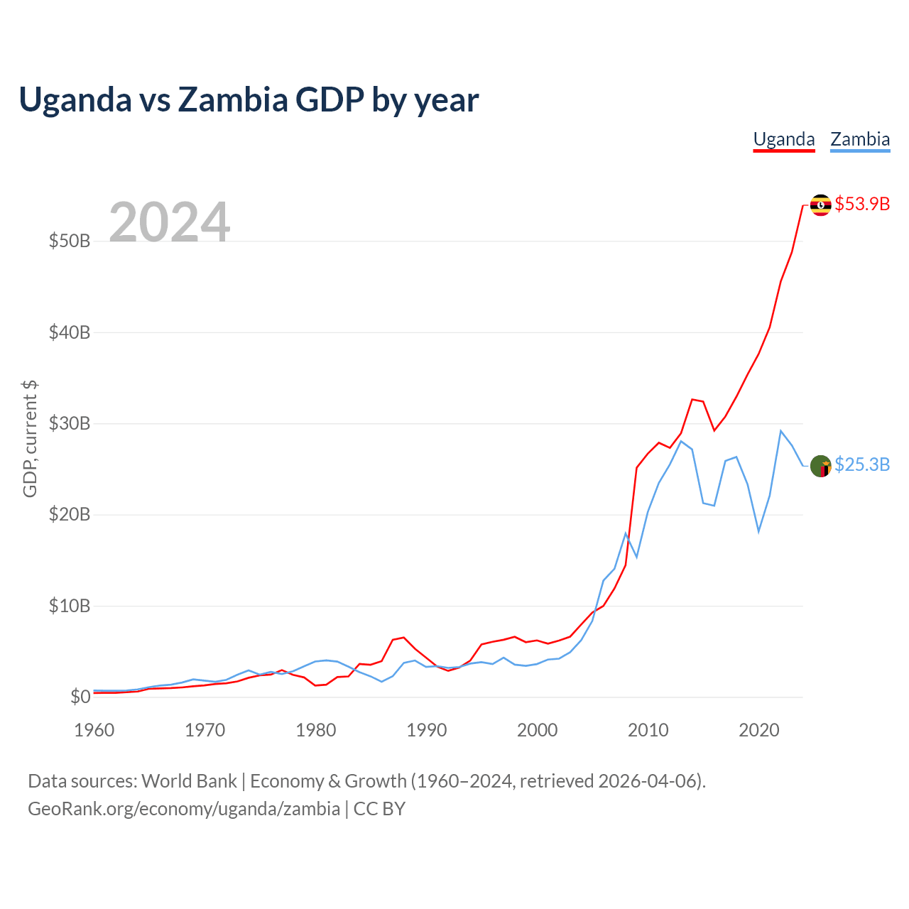 Uganda has a GDP of $53.9B compared to $25.3B for Zambia, ranking 89/197 and 116/197 by economy size, respectively.